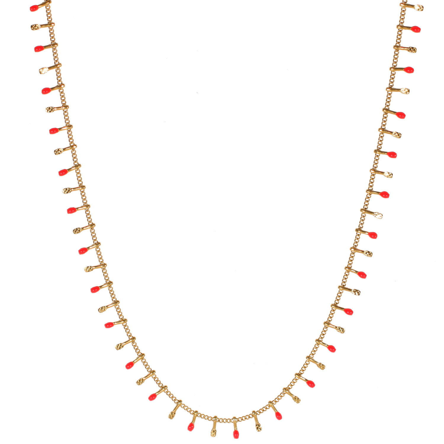 Description Collier composé d'une chaîne et de pampilles en acier doré et pampilles pavées d'émail de couleur rouge. Fermoir mousqueton avec 7 cm rallonge. Longueur 38+7 cm [Guide des tailles] Matière(s) Acier , Email . L'acier utilisé dans la bijouterie existe sous plusieurs qualités. Nous utilisons principalement la qualité 316L, qualité qui est utilisée en chirurgie. Cet acier est donc inoxydable et reste très résistant. Fermoir Mousqueton Couleur(s) dominante(s) Doré , Rouge Public Adolescent , Adulte . Genre Femme , Fille . Saison Indémodable . Cliquez sur une matière, un thème, une couleur ou une collection pour voir tous les articles associés.