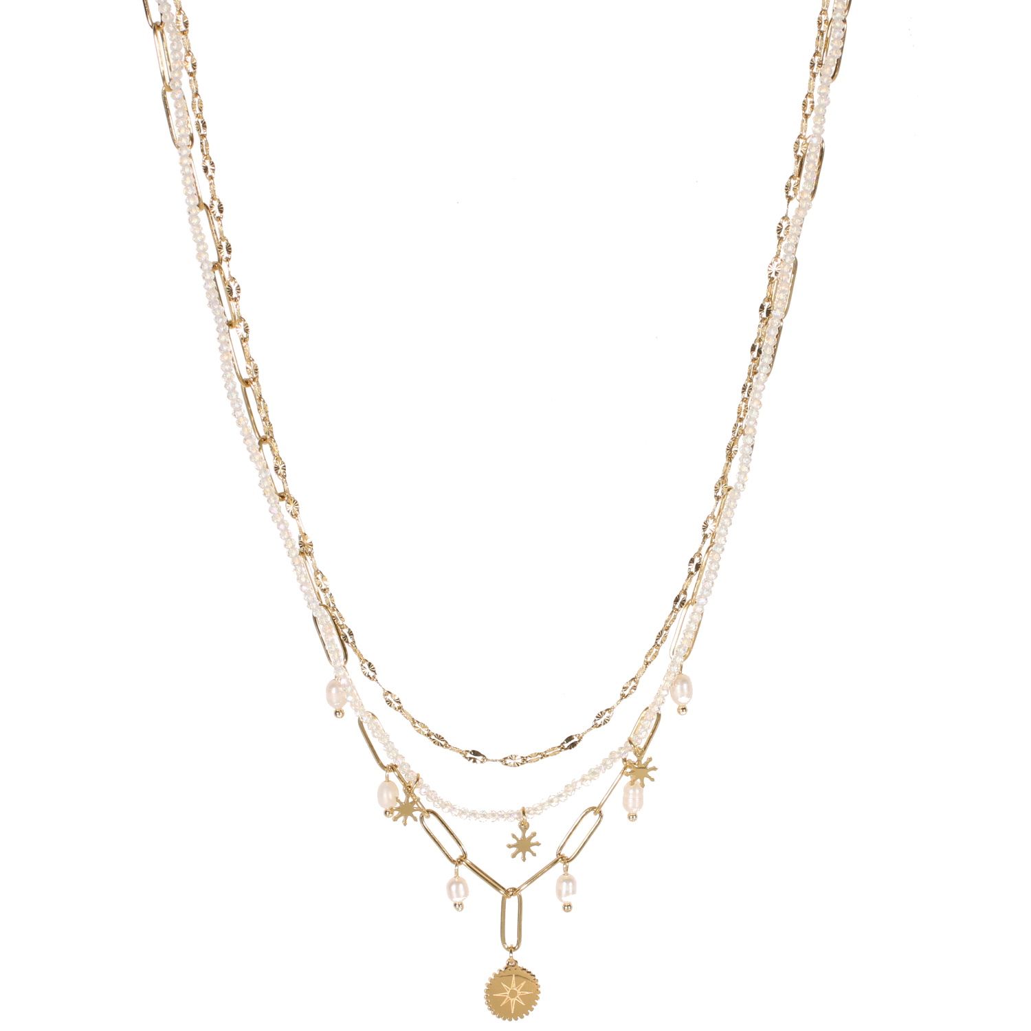 Collier triple rangs composé d'une chaîne de 39 cm de long en acier doré, un collier de 40 cm de long en perles de couleur avec trois étoiles en acier doré, ainsi qu'une chaîne de 44 cm de long en acier doré avec pampilles en nacre et un pendentif au motif d'étoile en acier doré.