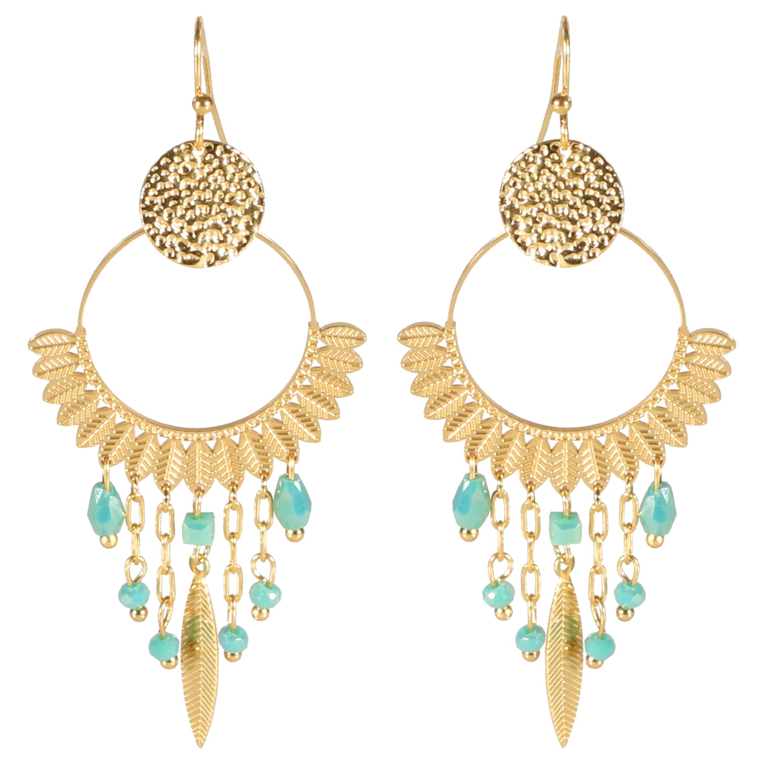 Description Boucles d'oreilles pendantes composées d'une puce ronde martelée en acier doré et un cercle avec plumes en acier doré et perles de couleur turquoise. Cliquez sur une matière, un thème, une couleur ou une collection pour voir tous les articles associés.