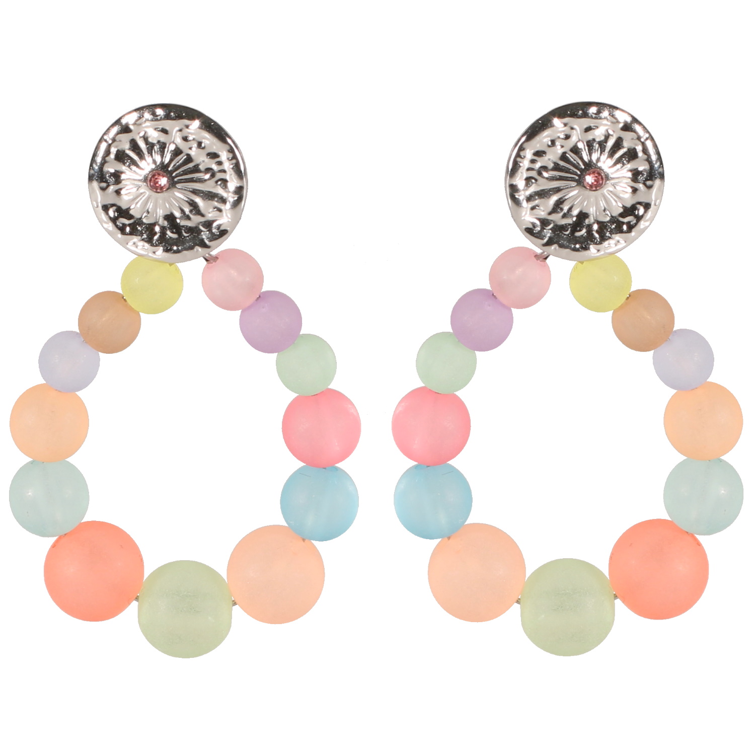 Boucles d'oreilles pendantes composées d'une pastille ronde martelée avec dessin d'étoile en acier argenté sertie d'un cristal de couleur rose et un cercle ovale de perles multicolores. Pendantes Perle Rond  Adolescent Adulte Eté Femme Fille