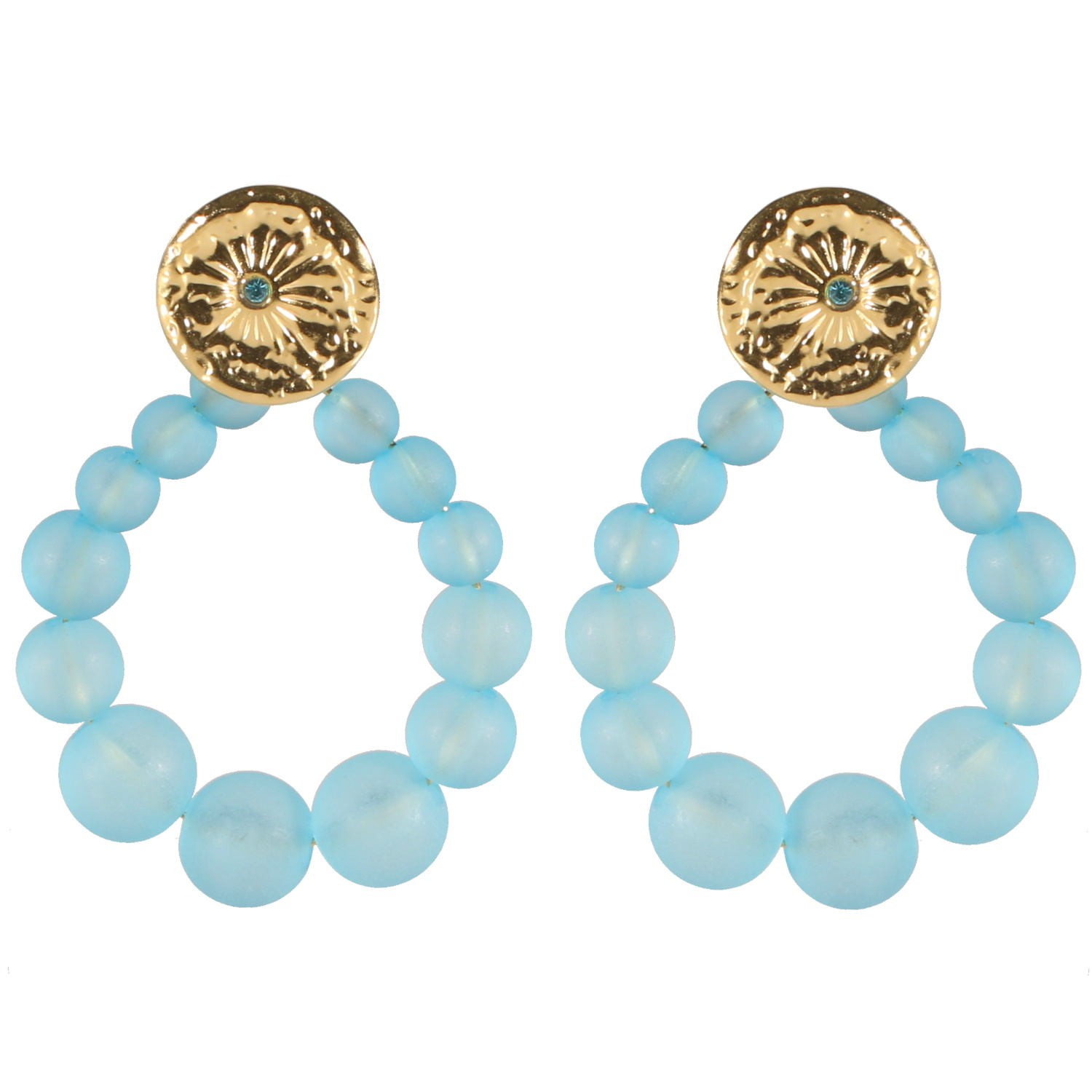 Boucles d'oreilles pendantes composées d'une pastille ronde martelée avec dessin de soleil en acier doré sertie d'un cristal de couleur bleue et un cercle ovale de perles de couleur bleue.