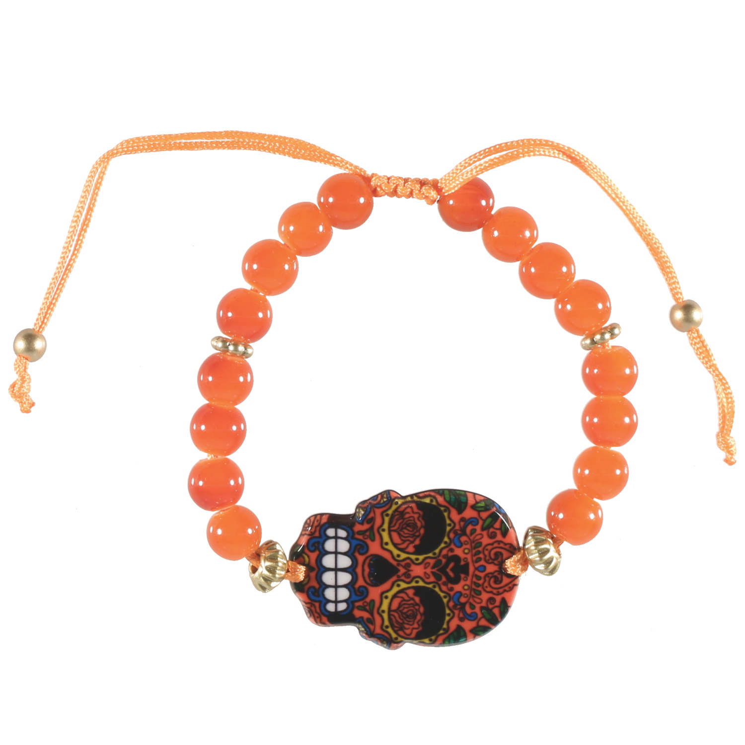 Bracelet fantaisie composé d'un cordon en textile avec perles de couleurs et une tête de mort avec dessins en émail de couleur.
