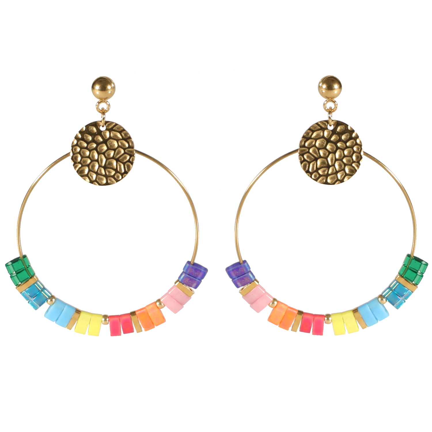 Description Boucles d'oreilles pendantes composées d'une pastille ronde martelée en acier doré et d'un cercle en acier doré avec des perles multicolores. Largeur 37 mm Hauteur 55 mm Matière(s) Acier , Résine . L'acier utilisé dans la bijouterie existe sous plusieurs qualités. Nous utilisons principalement la qualité 316L, qualité qui est utilisée en chirurgie. Cet acier est donc inoxydable et reste très résistant. Fermoir Tiges poussettes Couleur(s) dominante(s) Doré , Multicolore Public Adolescent , Adulte . Genre Femme , Fille . Saison Eté . Collection Hippie chic Cliquez sur une matière, un thème, une couleur ou une collection pour voir tous les articles associés.