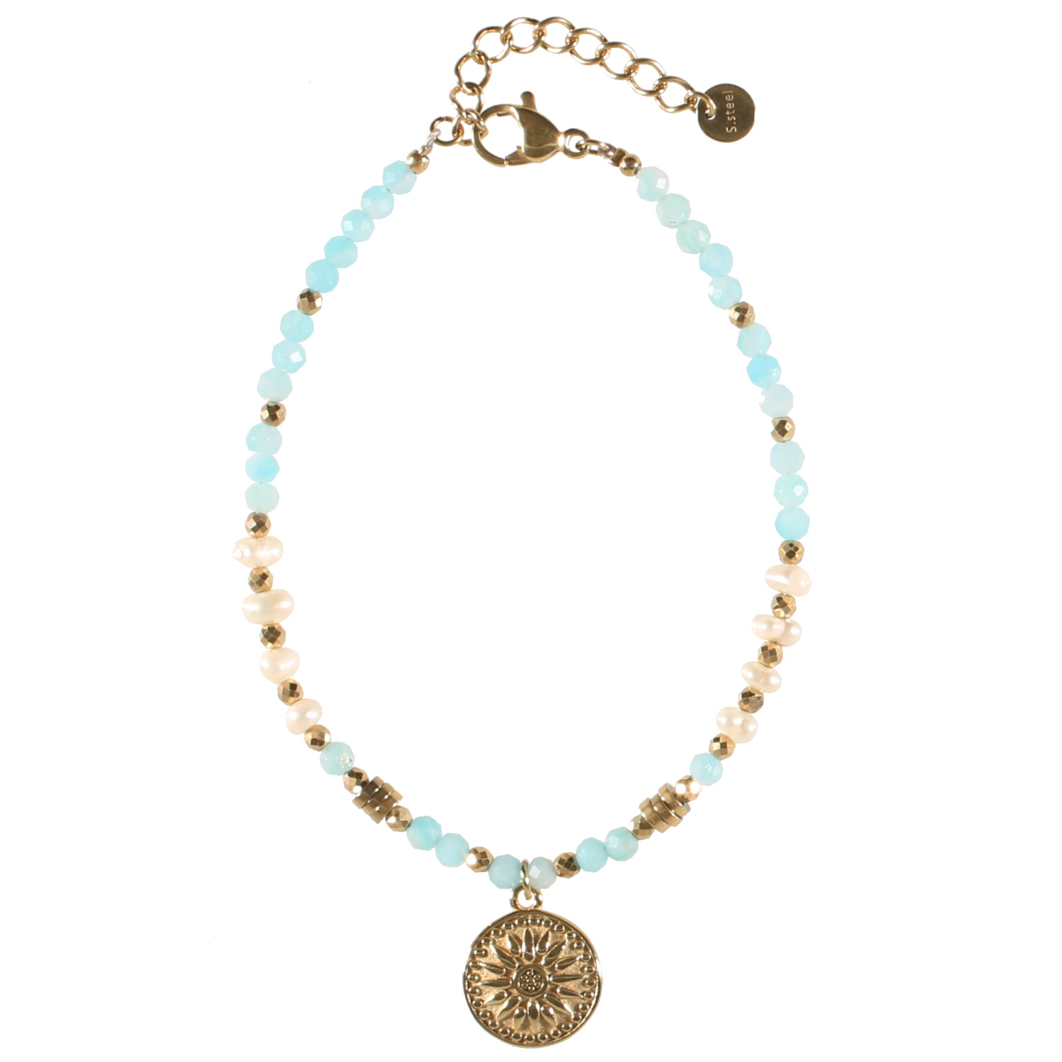 Bracelet avec perles en acier doré, perles en véritable pierre d'Amazonite, perles de nacre et un pendant rond avec représentation du soleil en acier doré.