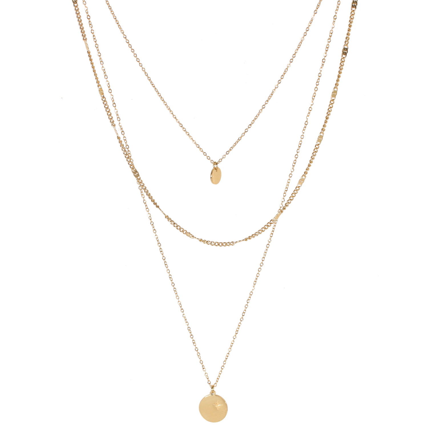Description Collier sautoir triple rangs composé d'une chaîne de 38 cm de long avec pendentif pastille ronde en acier doré, d'une chaîne de 44 cm de long en acier doré, ainsi qu'une chaîne de 57 cm de long avec pendentif pastille ronde au dessin d'étoile en acier doré. Fermoir mousqueton avec 7 cm de rallonge. Longueur 38+7 cm [Guide des tailles] Matière(s) Acier . L'acier utilisé dans la bijouterie existe sous plusieurs qualités. Nous utilisons principalement la qualité 316L, qualité qui est utilisée en chirurgie. Cet acier est donc inoxydable et reste très résistant. Fermoir Mousqueton À noter Pendentifs 7 mm et 12 mm de diamètre Couleur(s) dominante(s) Doré Public Adolescent , Adulte . Genre Femme , Fille . Saison Indémodable . Thème(s) Nature . Collection Astre sublime Cliquez sur une matière, un thème, une couleur ou une collection pour voir tous les articles associés.
