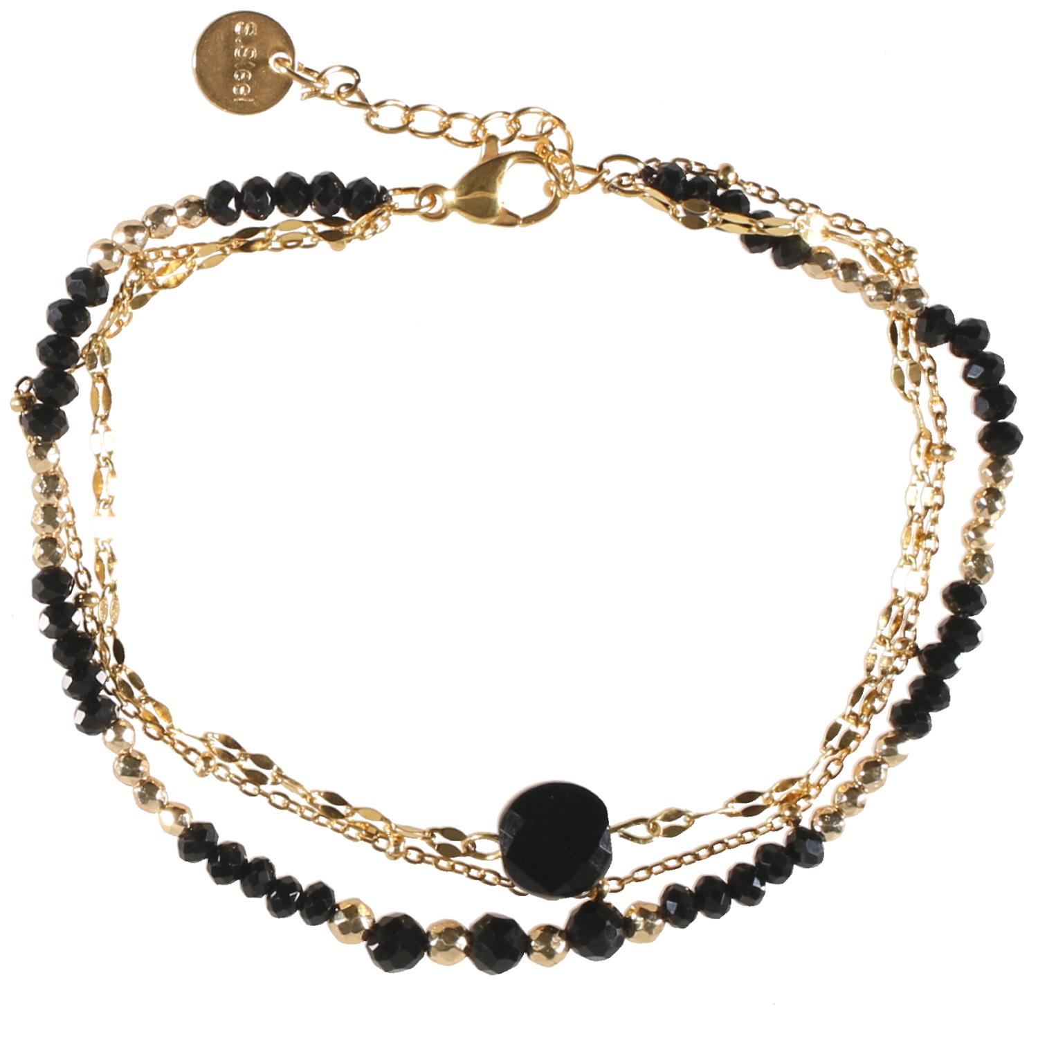 Description Bracelet triple rangs composé d'une chaîne en acier doré, d'une chaîne en acier doré et d'une pierre ronde de couleur noire, ainsi qu'une chaîne de perles en acier doré et de perles de couleur noire. Fermoir mousqueton avec 3 cm de rallonge. Cliquez sur une matière, un thème, une couleur ou une collection pour voir tous les articles associés.