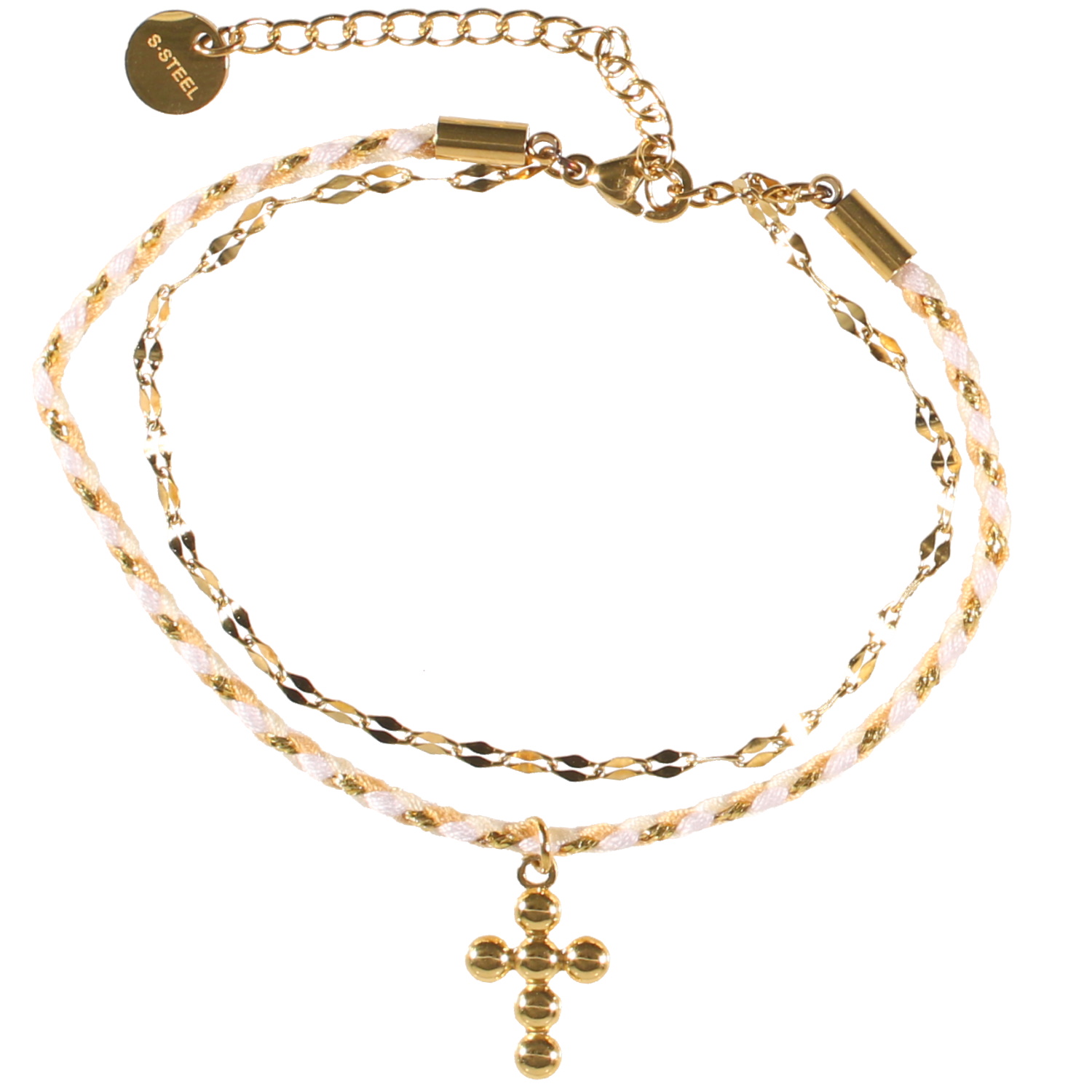 Bracelet double rangs composé d'une chaîne en acier doré, ainsi qu'un cordon en coton de couleur blanche, marron et dorée avec un pendant croix en acier doré.