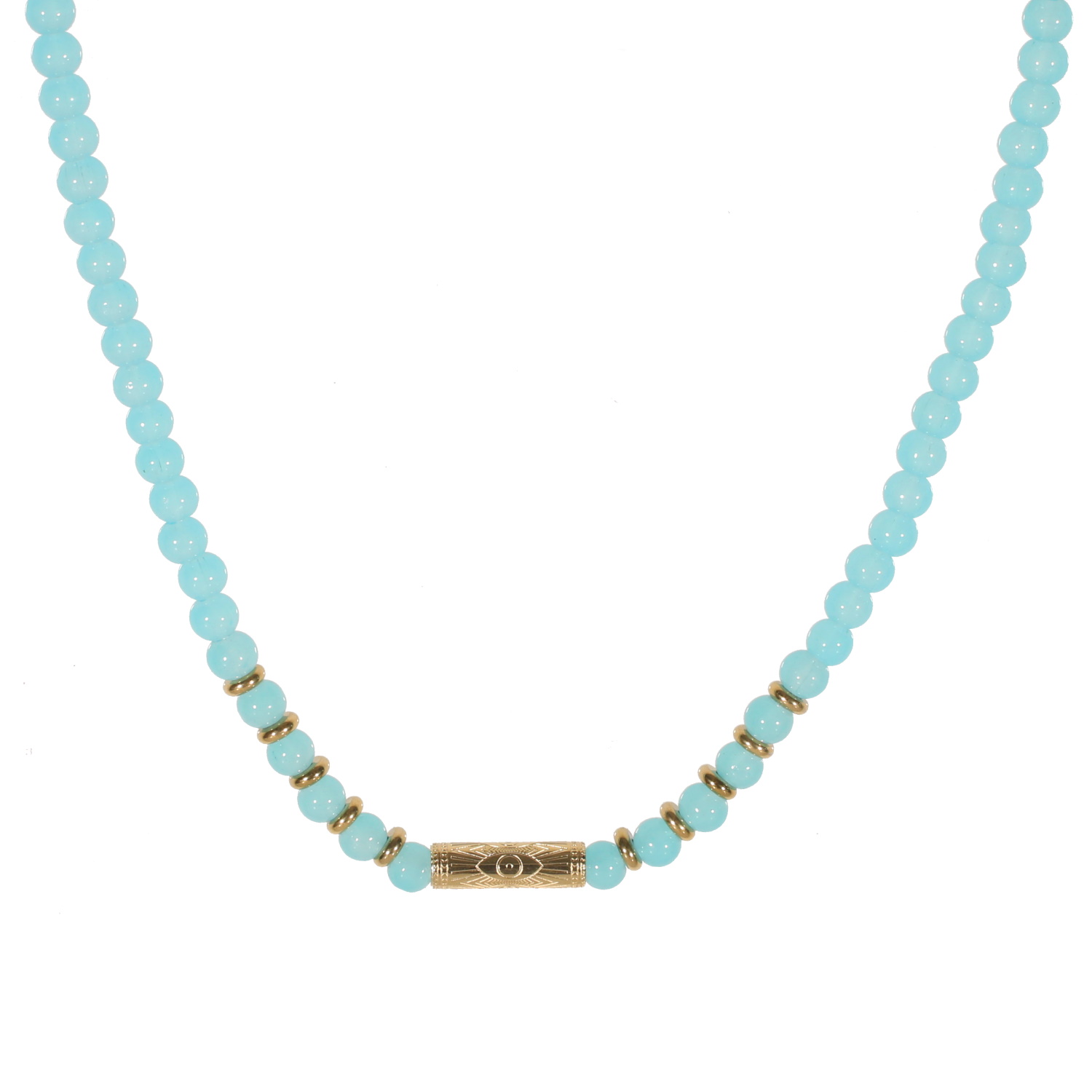 Collier composé de perles et un tube cylindrique en acier doré avec motifs d'œil de Turquie, ainsi que des perles de couleur turquoise.
