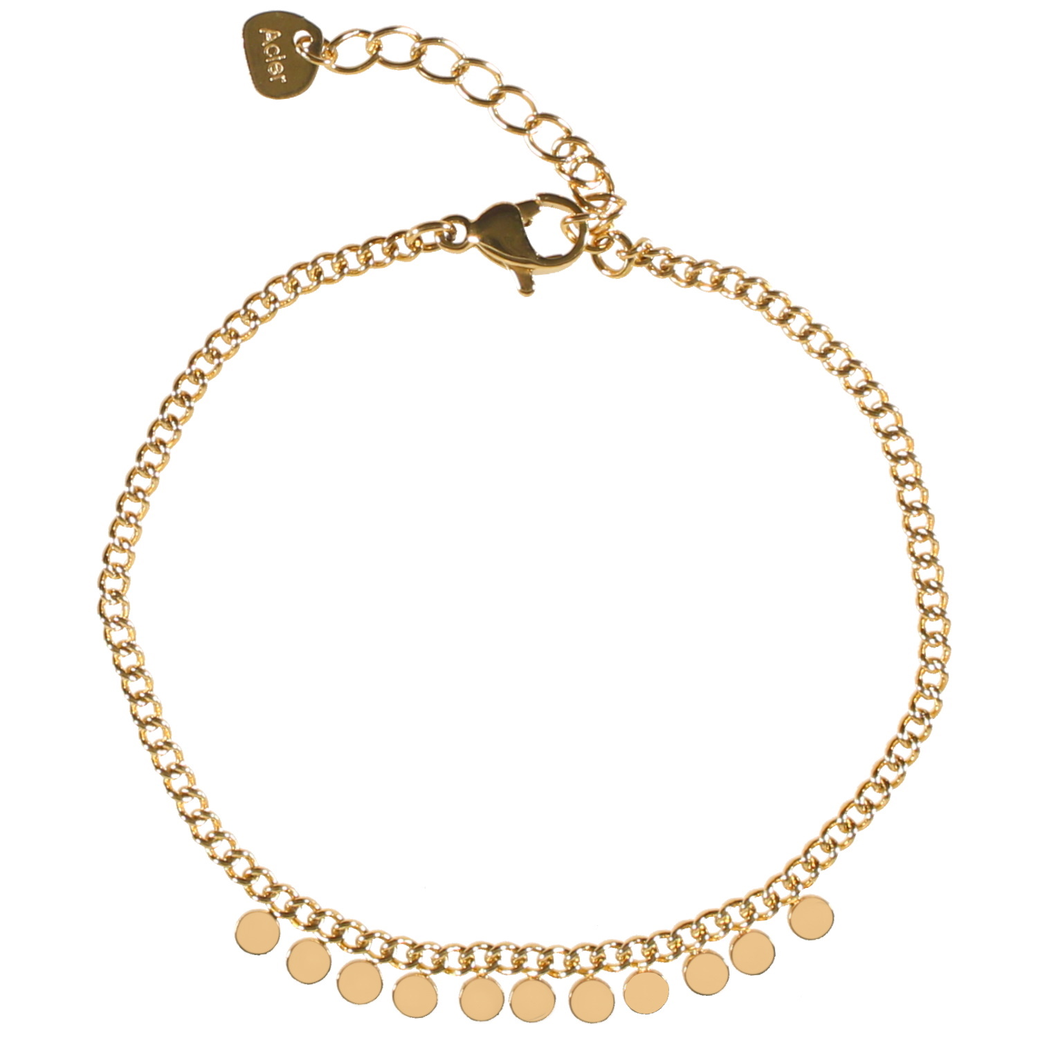 Description Bracelet composé d'une chaîne avec pampilles rondes en acier doré. Fermoir mousqueton avec 3 cm de rallonge. Longueur 16+3 cm [Guide des tailles] Largeur 6 mm Matière(s) Acier . L'acier utilisé dans la bijouterie existe sous plusieurs qualités. Nous utilisons principalement la qualité 316L, qualité qui est utilisée en chirurgie. Cet acier est donc inoxydable et reste très résistant. Fermoir Mousqueton Couleur(s) dominante(s) Doré Public Adolescent , Adulte . Genre Femme , Fille . Saison Indémodable . Cliquez sur une matière, un thème, une couleur ou une collection pour voir tous les articles associés.