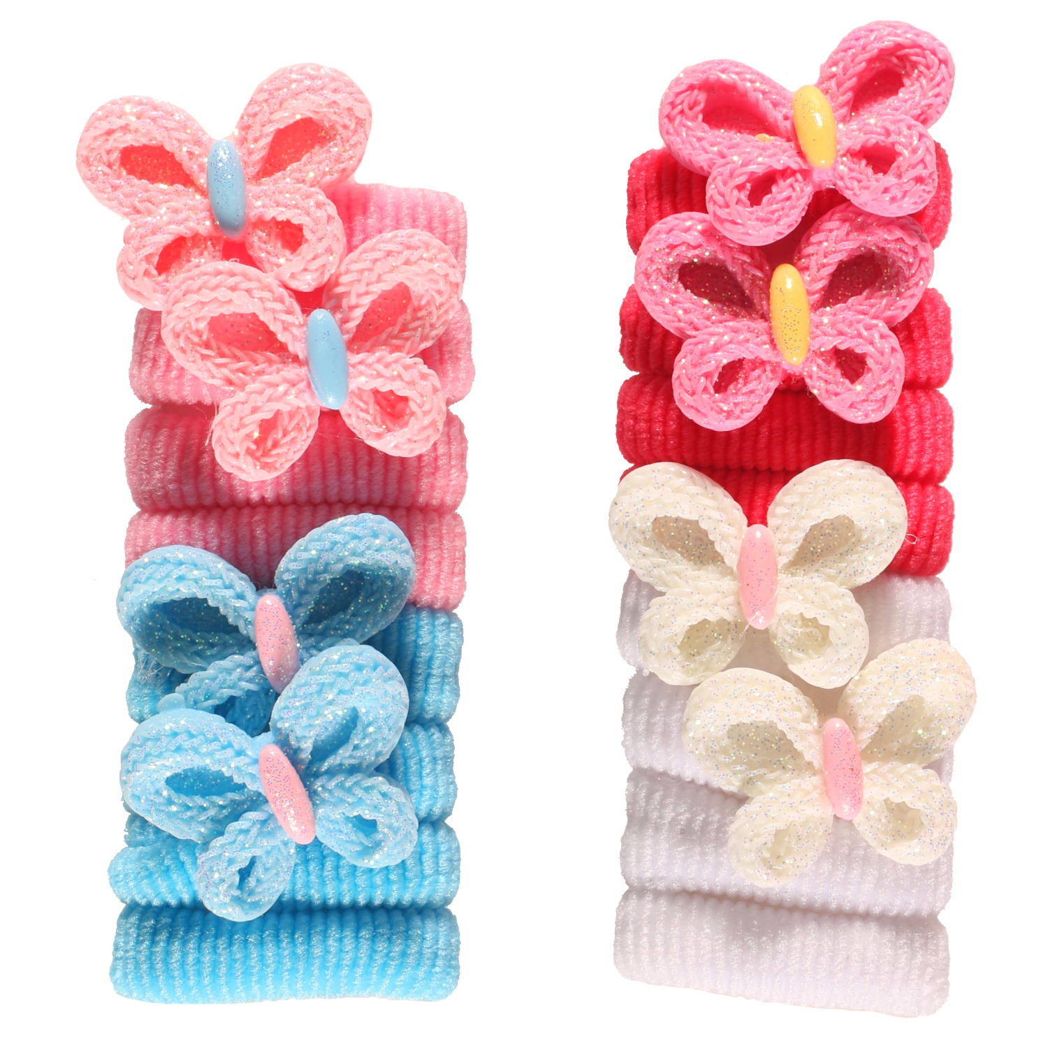 Lot de 8 chouchou élastiques pour cheveux en textile de couleur avec papillons en matière synthétique.
