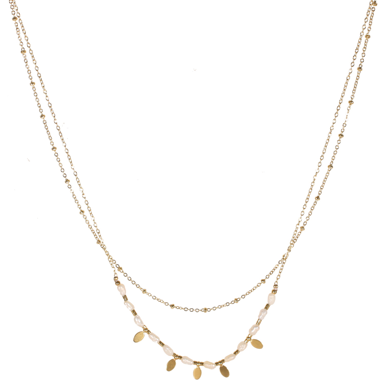 Description Collier double rangs composé d'une chaîne de 39 cm de long en acier doré, ainsi qu'une chaîne de 42 cm de long avec pampilles ovales en acier doré surmontée de perles en nacre. Fermoir mousqueton avec 5 cm de rallonge. Longueur 39+5 cm [Guide des tailles] Largeur 7 mm Matière(s) Acier , Nacre . L'acier utilisé dans la bijouterie existe sous plusieurs qualités. Nous utilisons principalement la qualité 316L, qualité qui est utilisée en chirurgie. Cet acier est donc inoxydable et reste très résistant. Fermoir Mousqueton Couleur(s) dominante(s) Blanc , Doré Public Adolescent , Adulte . Genre Femme , Fille . Saison Eté . Thème(s) Nature . Collection Seaside Cliquez sur une matière, un thème, une couleur ou une collection pour voir tous les articles associés.