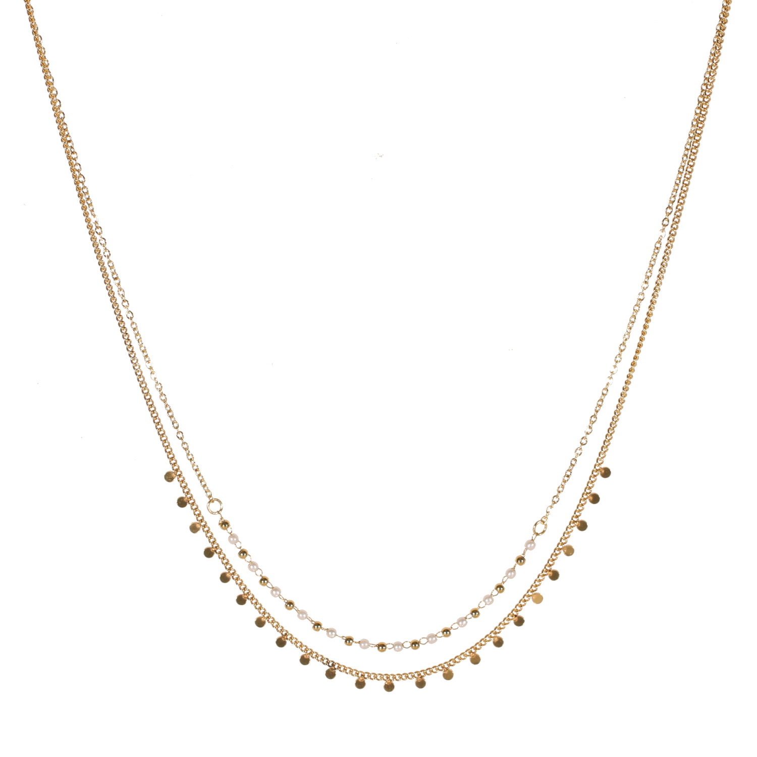 Collier double rangs composé d'une chaîne de 39 cm de long en acier doré avec perles en nacre et acier doré, ainsi qu'une chaîne de 40 cm de long avec pampilles rondes en acier doré.