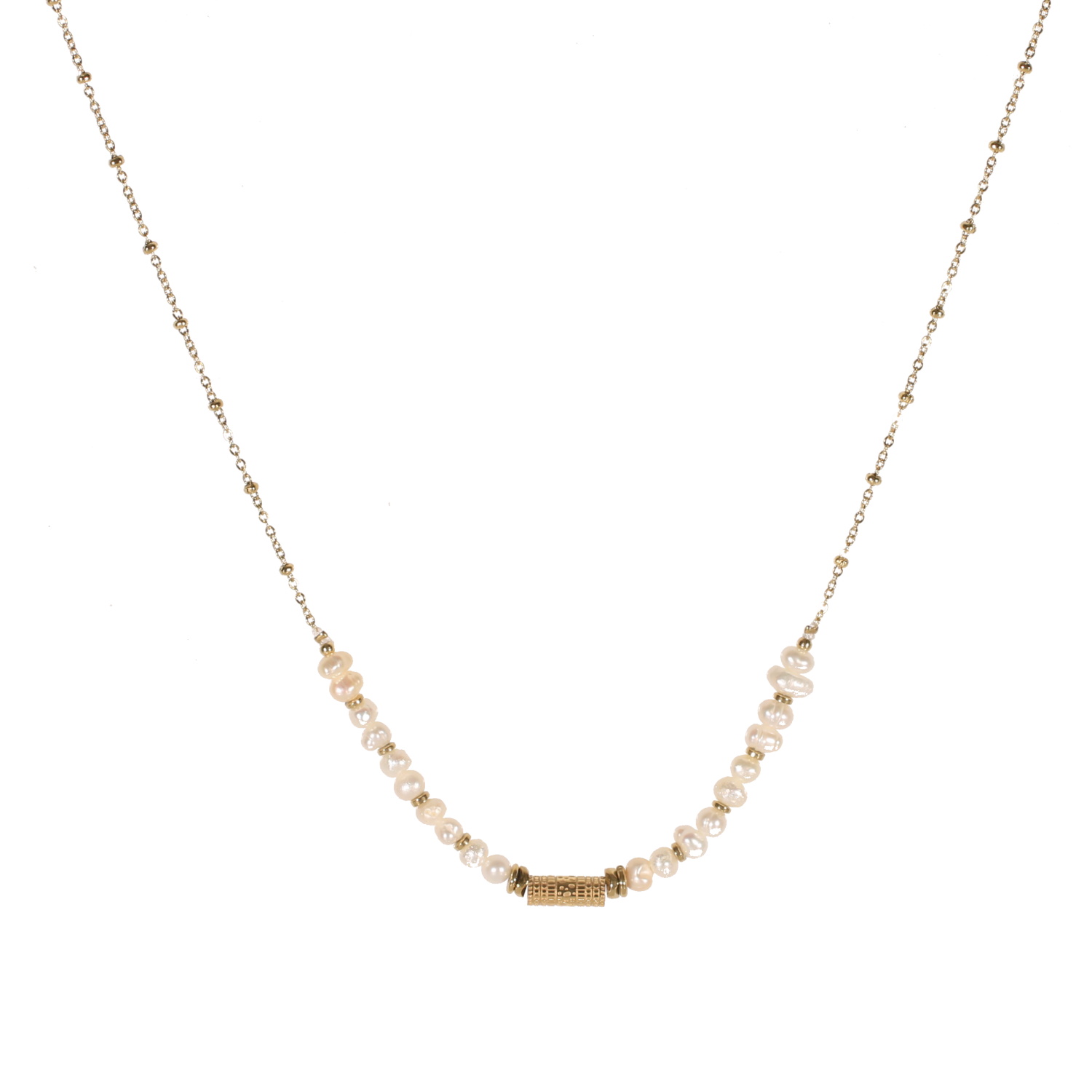 Description Collier composé d'une chaîne avec boules en acier doré, de perles de nacre et d'un tube cylindrique avec motifs en acier doré. Fermoir mousqueton avec 5 cm de rallonge. Longueur 39+5 cm [Guide des tailles] Largeur 6 mm Matière(s) Acier , Nacre . L'acier utilisé dans la bijouterie existe sous plusieurs qualités. Nous utilisons principalement la qualité 316L, qualité qui est utilisée en chirurgie. Cet acier est donc inoxydable et reste très résistant. Fermoir Mousqueton Couleur(s) dominante(s) Blanc , Doré Public Adolescent , Adulte . Genre Femme , Fille . Saison Indémodable . Cliquez sur une matière, un thème, une couleur ou une collection pour voir tous les articles associés.