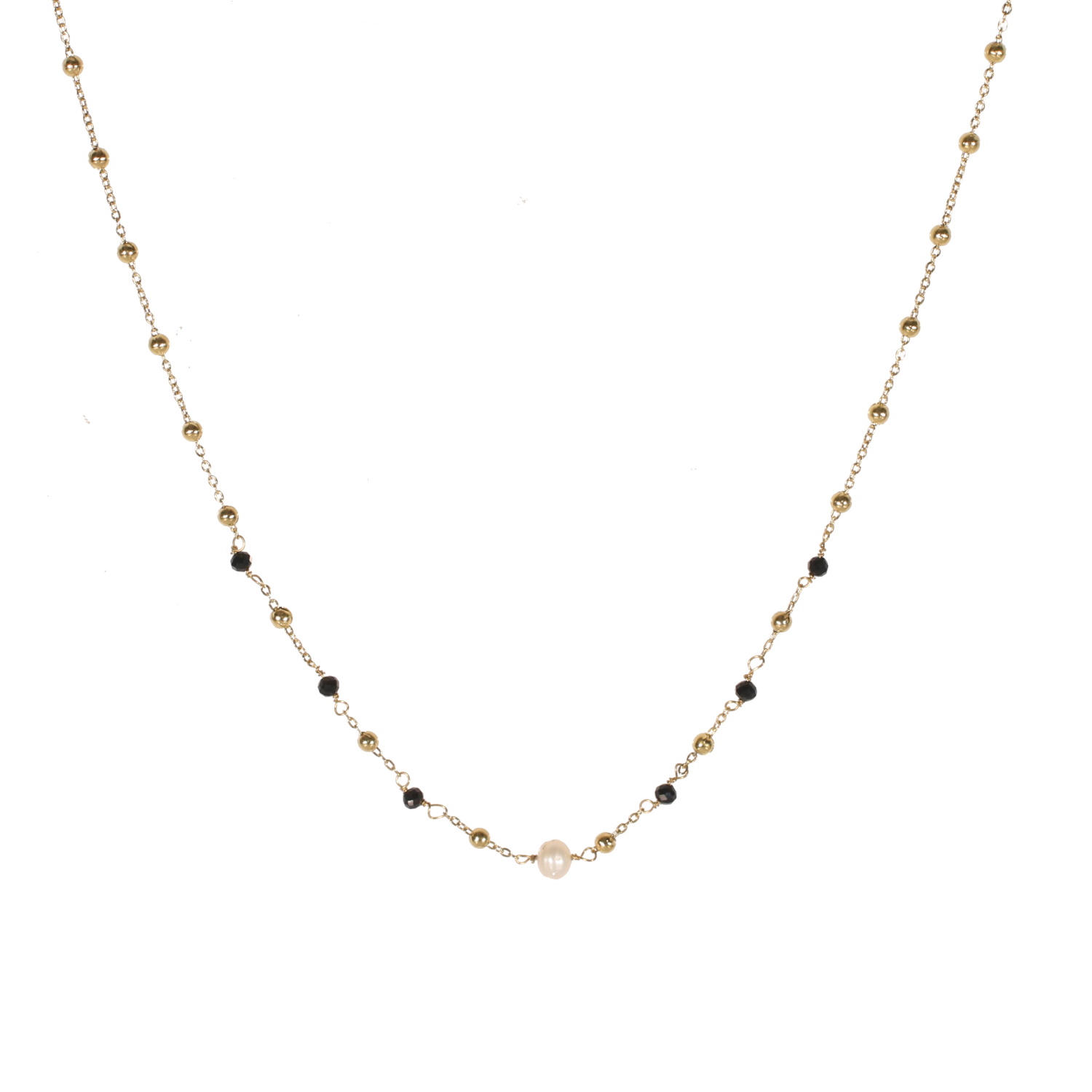 Collier composé d'une chaîne avec boules en acier doré, de perles en véritable pierre d'agate et d'une perle de nacre.