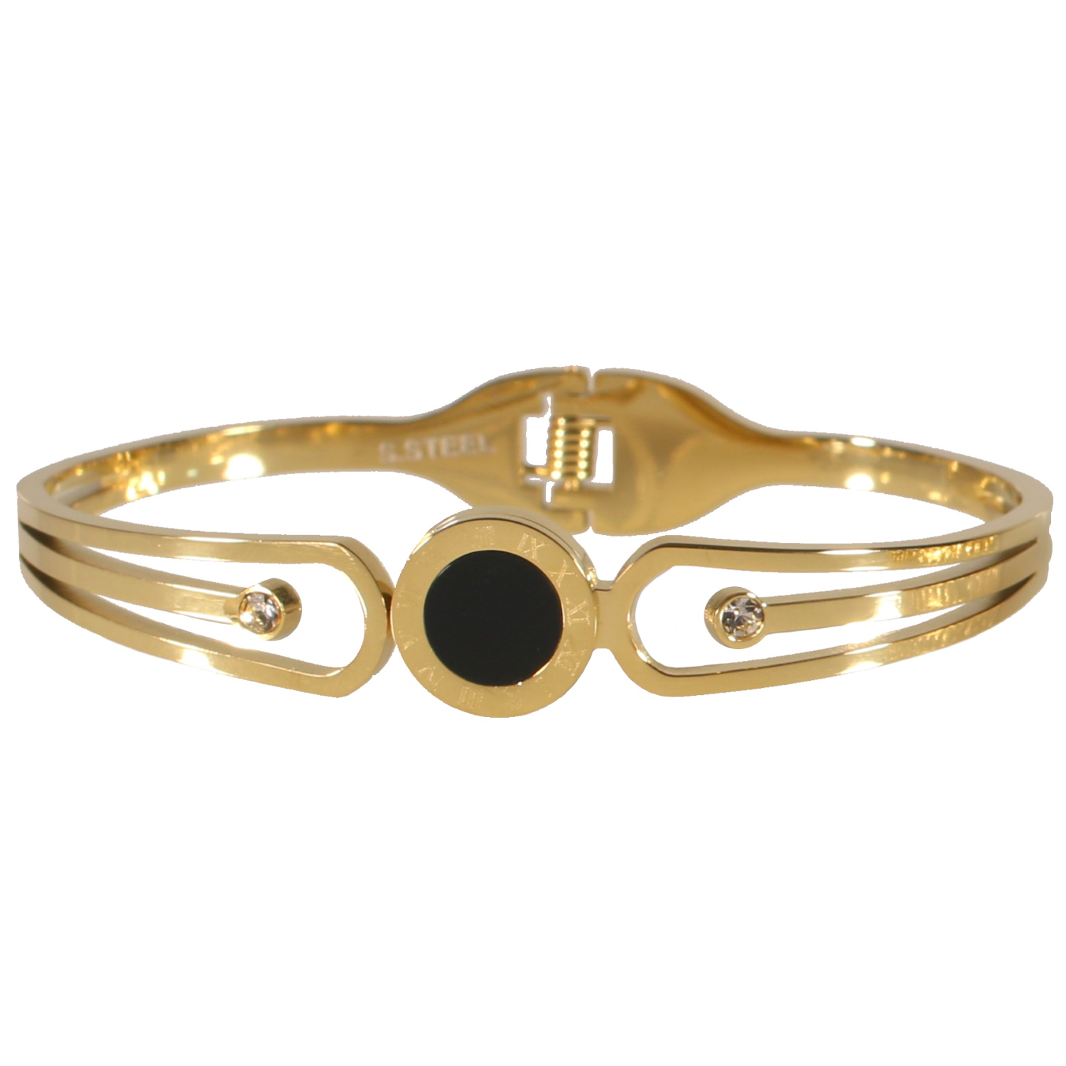 Bracelet jonc fermé rigide en acier doré surmonté d'une pastille ronde avec numérotation horaire sertie clos d'une pierre lisse de couleur noire et de deux strass.