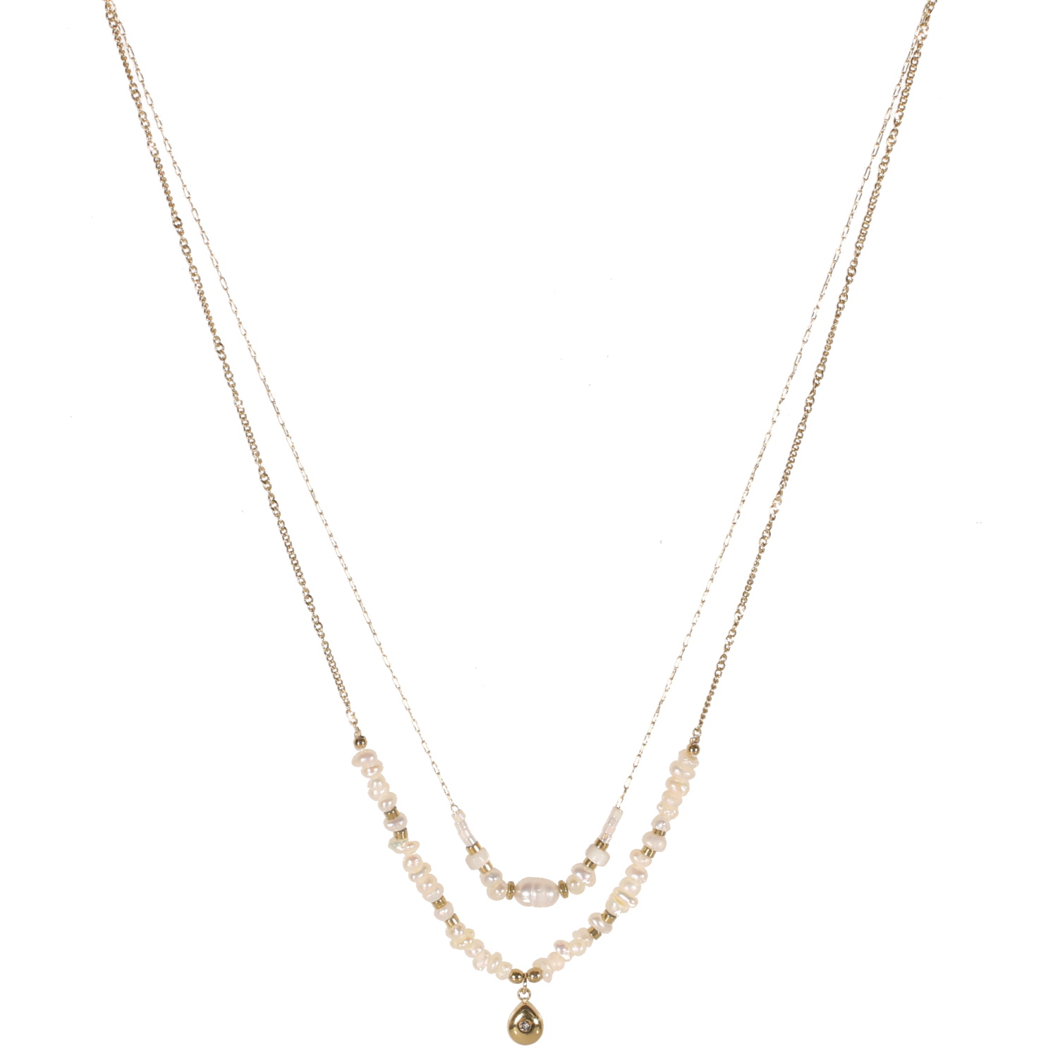 Collier double rangs composé d'une chaîne de 39 cm de long en acier doré et de perles de nacre, ainsi qu'une chaîne de 40 cm de long en acier doré, des perles de nacre et un pendentif en forme de goutte en acier doré serti d'un strass.