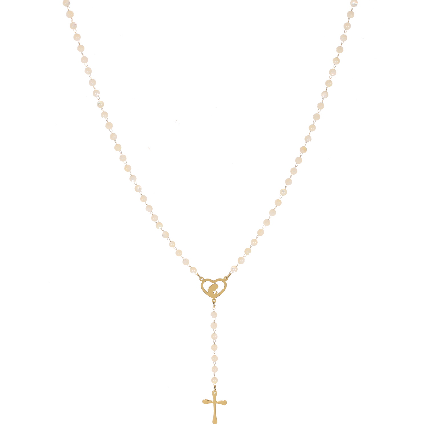 Collier chapelet composé d'une chaîne en acier doré, des perles de nacre, un médaillon en forme de cœur avec une prieuse et une croix en acier doré.