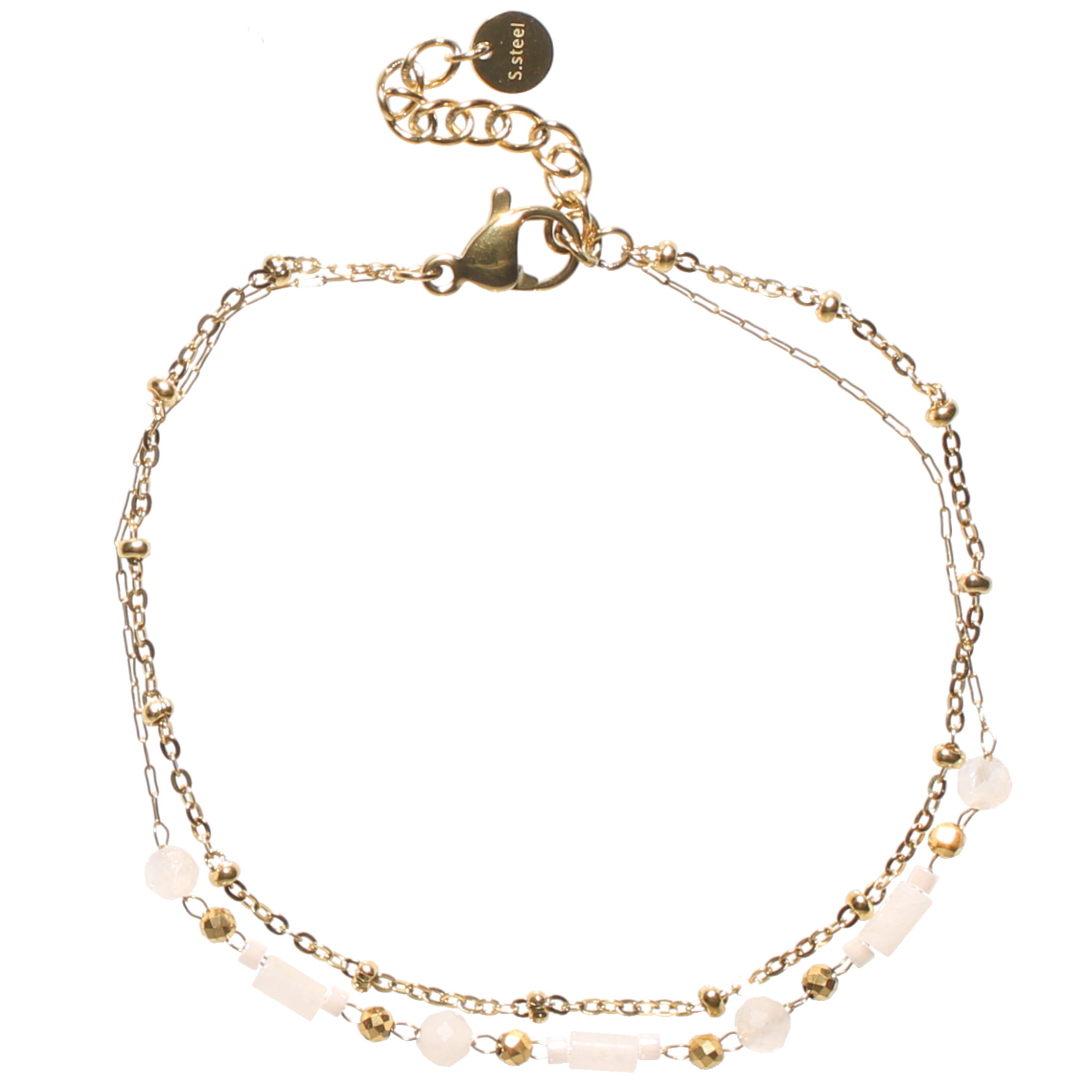 Bracelet double rangs composé d'une chaîne en acier doré et d'une chaîne en acier doré avec perles de couleur blanche.