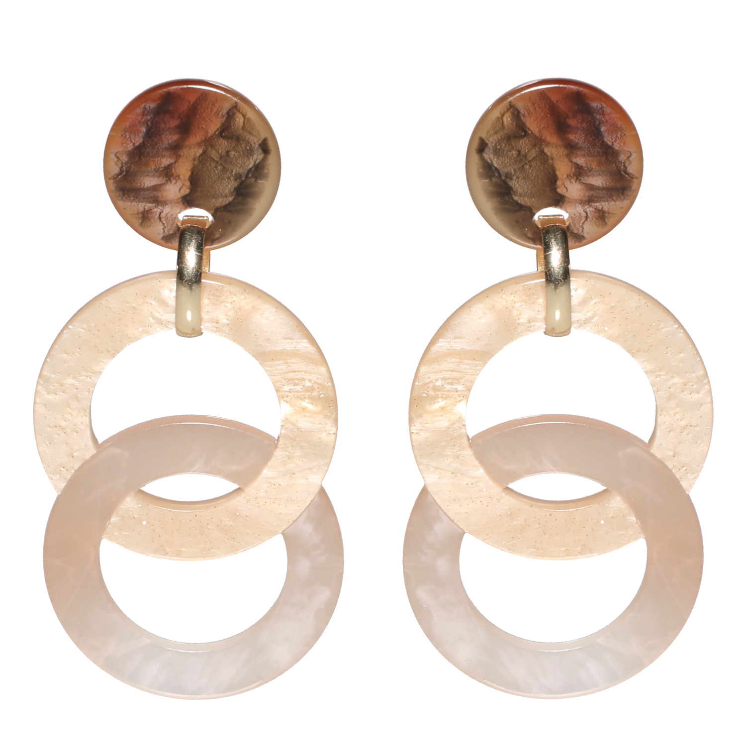 Boucles d'oreilles pendantes fantaisies composées d'une pastille ronde de couleur marron et de deux cercles entrelacés de couleur blanche et marron.
