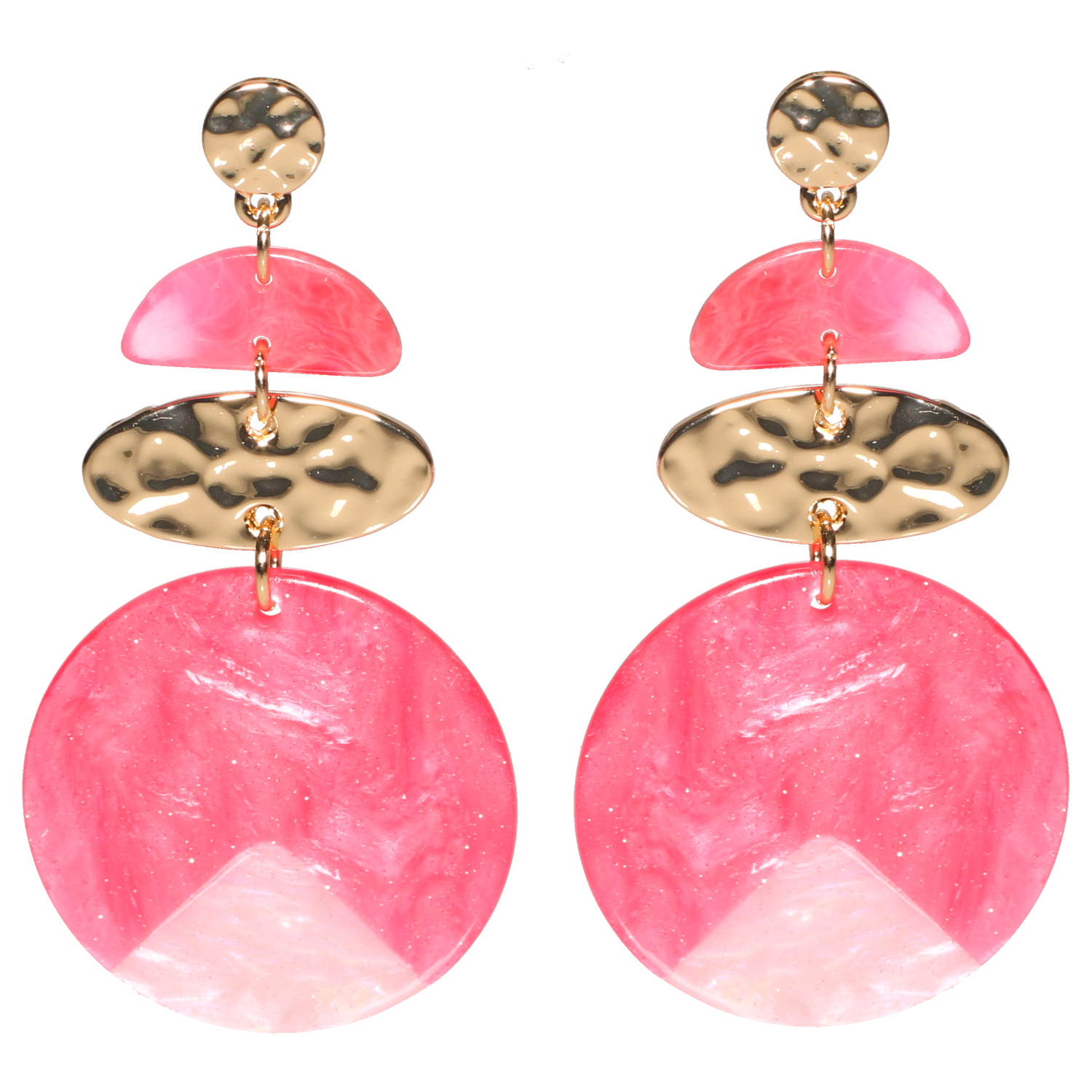 Boucles d'oreilles pendantes fantaisies composées de deux pastilles martelées rondes et ovales en métal doré, d'une pastille demi cercle de couleur rose et d'une pastille ronde de couleur rose.