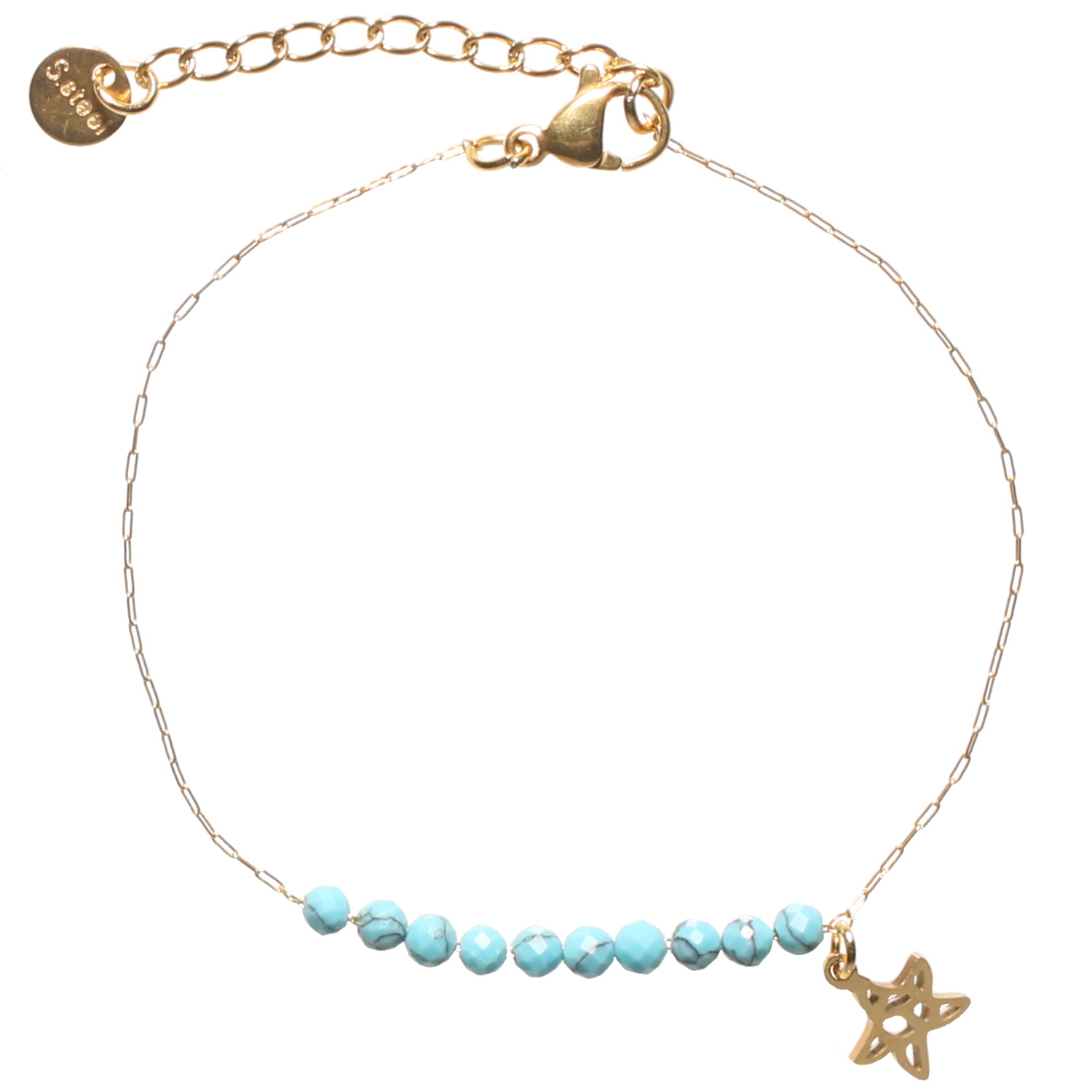 Description Bracelet composé d'une chaîne avec un pendant en forme d'étoile de mer et de perles de couleur bleue turquoise. Fermoir mousqueton avec 3 cm de rallonge. Longueur 17+3 cm [Guide des tailles] Largeur 10 mm Matière(s) Acier , Rocaille . L'acier utilisé dans la bijouterie existe sous plusieurs qualités. Nous utilisons principalement la qualité 316L, qualité qui est utilisée en chirurgie. Cet acier est donc inoxydable et reste très résistant. Fermoir Mousqueton Couleur(s) dominante(s) Bleu , Doré Public Adolescent , Adulte . Genre Femme , Fille . Saison Indémodable . Thème(s) Nature . Cliquez sur une matière, un thème, une couleur ou une collection pour voir tous les articles associés.