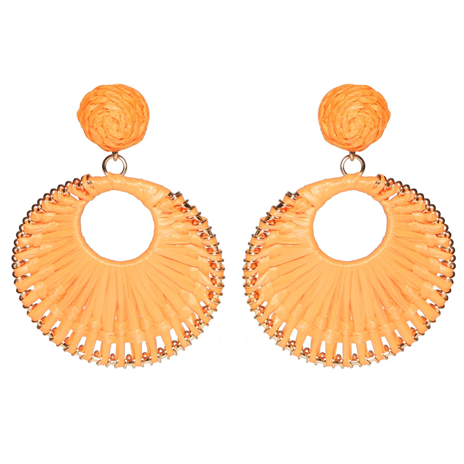 Boucles d'oreilles fantaisies pendantes en acier doré et paille artificielle de couleur orange.