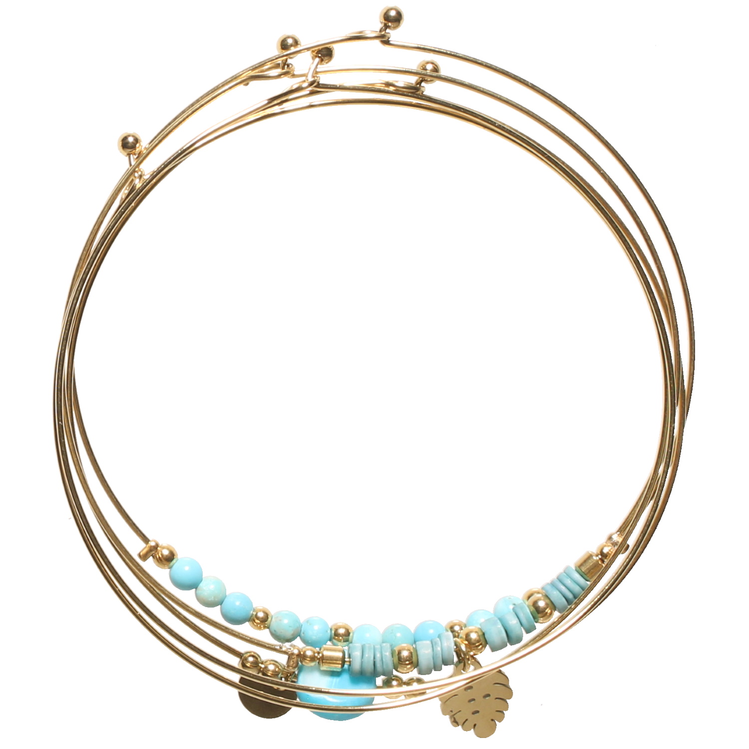 Lot de 5 bracelets joncs en acier doré surmontés de perles en turquoise d'imitation et d'une pierre ronde de couleur bleue turquoise nacrée avec une feuille philodendron en acier doré.