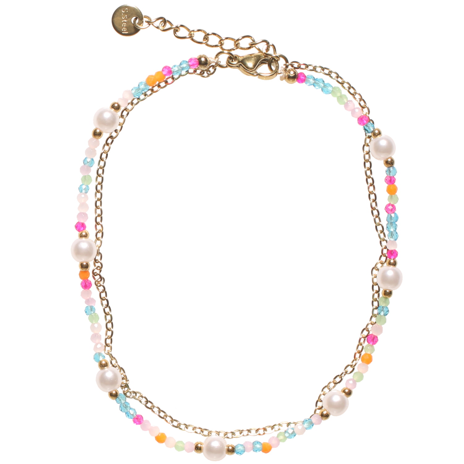 Bracelet chaîne de cheville double rangs composé d'une chaîne en acier doré, ainsi qu'une chaîne avec perles en acier doré, perles multicolores et perles d'imitation.