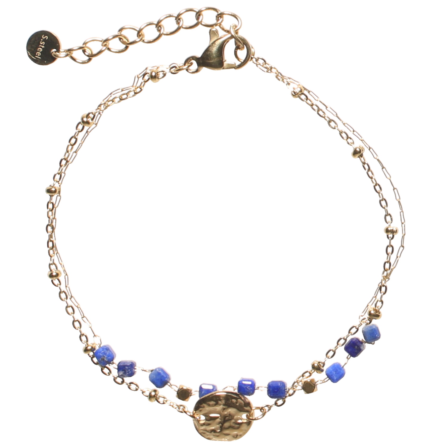 Description Bracelet double rangs composé d'une chaîne avec une pastille ronde martelée en acier doré, ainsi qu'une chaîne en acier doré avec des perles cubiques de couleur bleue. Fermoir mousqueton avec 3 cm de rallonge. Longueur 16+3 cm [Guide des tailles] Largeur 10 mm Matière(s) Acier , Rocaille . L'acier utilisé dans la bijouterie existe sous plusieurs qualités. Nous utilisons principalement la qualité 316L, qualité qui est utilisée en chirurgie. Cet acier est donc inoxydable et reste très résistant. Fermoir Mousqueton Couleur(s) dominante(s) Bleu , Doré Public Adolescent , Adulte . Genre Femme , Fille . Saison Indémodable . Cliquez sur une matière, un thème, une couleur ou une collection pour voir tous les articles associés.