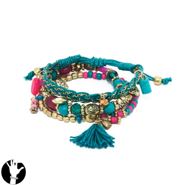 Bracelet fantaisie en métal doré, pierres naturelles, verre et coton.