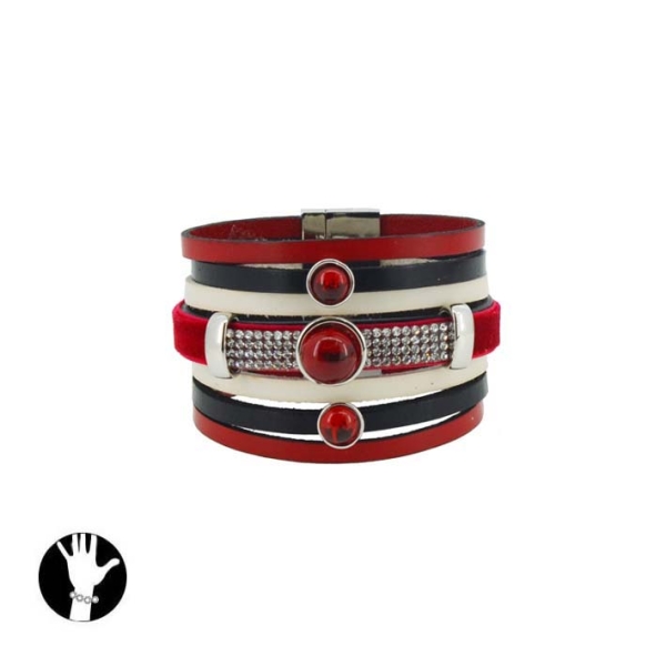 Bracelet fantaisie en métal argenté, cuir et verre.