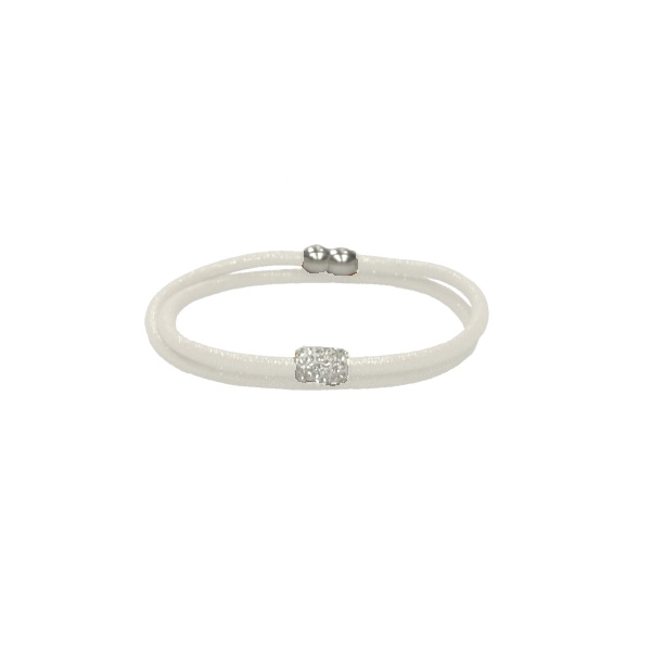 Bracelet fantaisie en coton, métal argenté et verre.