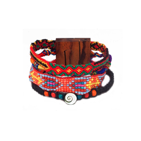 Bracelet fantaisie en bois, rocaille, textile et verre.