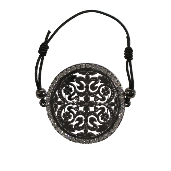 Bracelet fantaisie en gun métal, coton et verre.