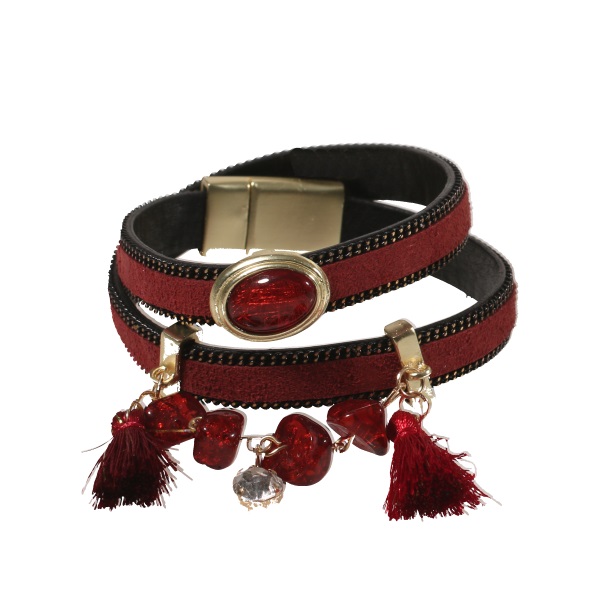 Bracelet fantaisie en cuir, textile et verre.
