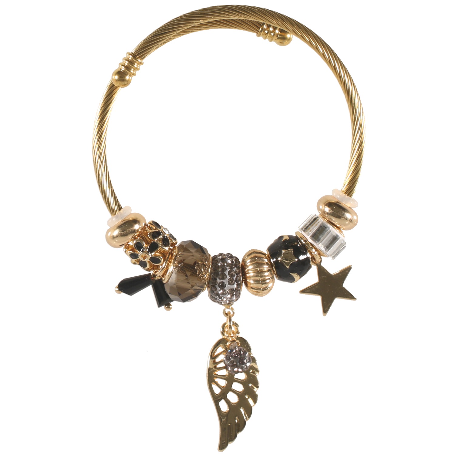 Bracelet fantaisie charm's avec breloques (aile d'ange, étoile, fleurs...) en métal doré, cristaux de couleur, émail et strass.