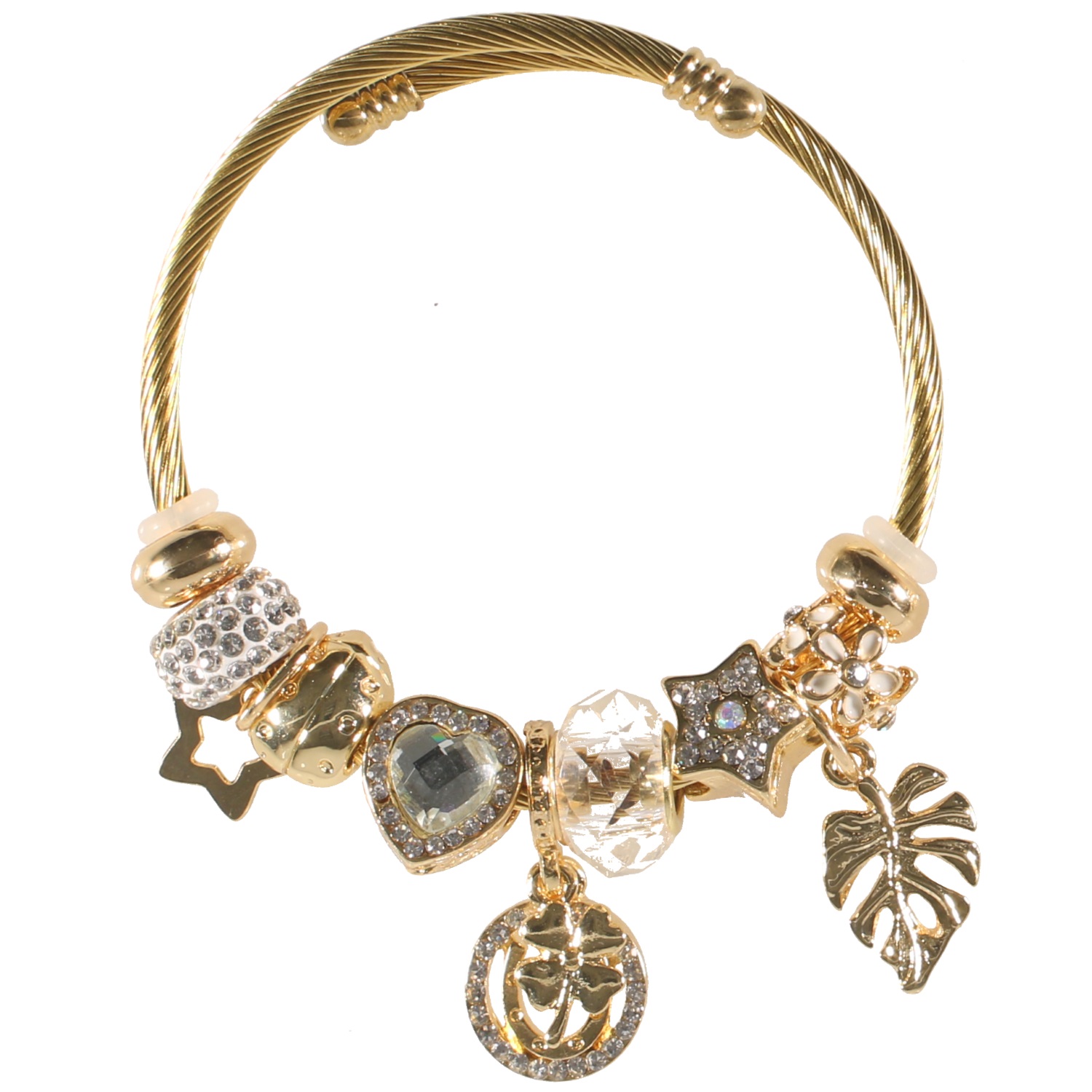 Bracelet fantaisie charm's avec breloques (cœur, étoile, fer à cheval, trèfle, fleur, coccinelle...) en métal doré, émail, strass et cristal de couleur.
