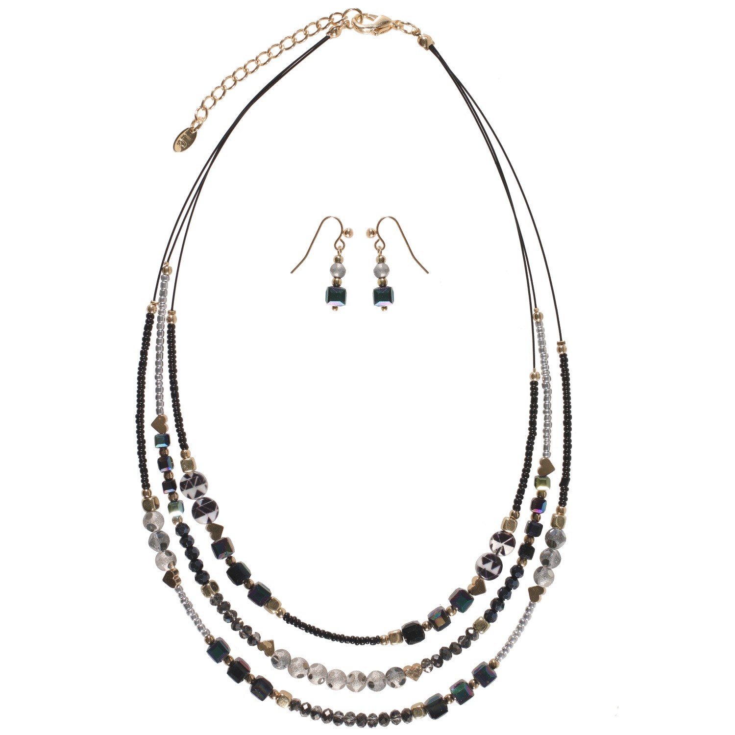 Parure fantaisie composée d'un collier multi rangs et d'une paire de boucles d'oreilles pendantes en métal doré, pierres et perles de couleur.