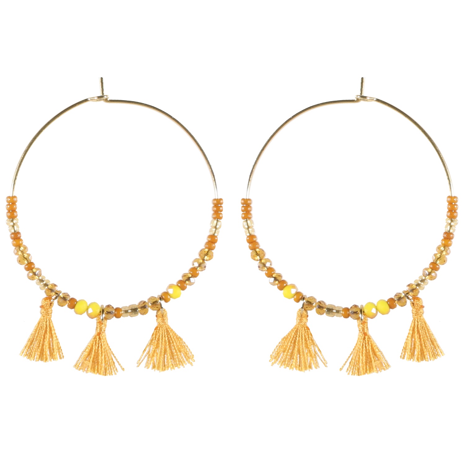 Boucles d'oreilles créoles fantaisie en métal doré, perles de couleur et pompons en textile.
