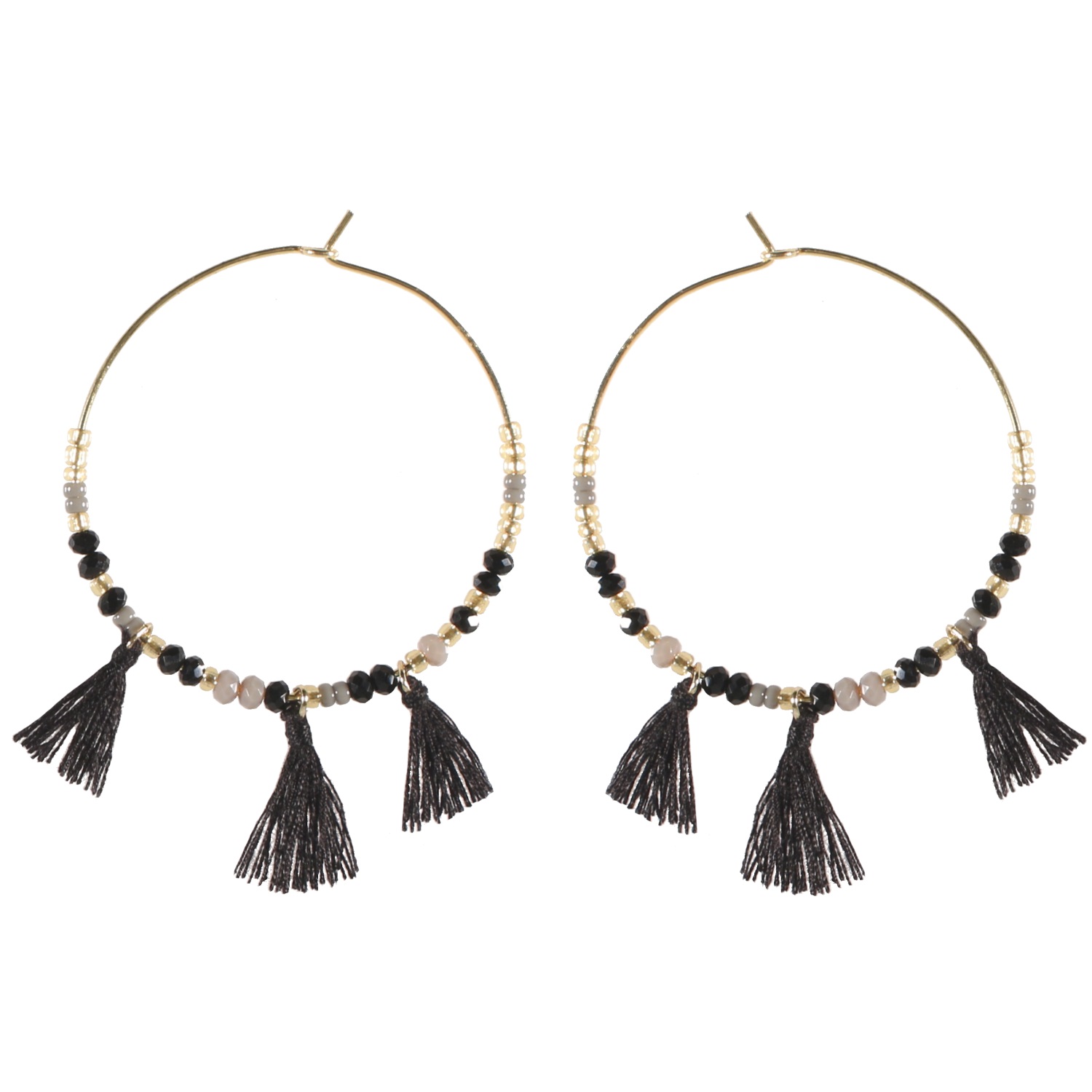 Boucles d'oreilles créoles fantaisie en métal doré, perles de couleur et pompons en textile.