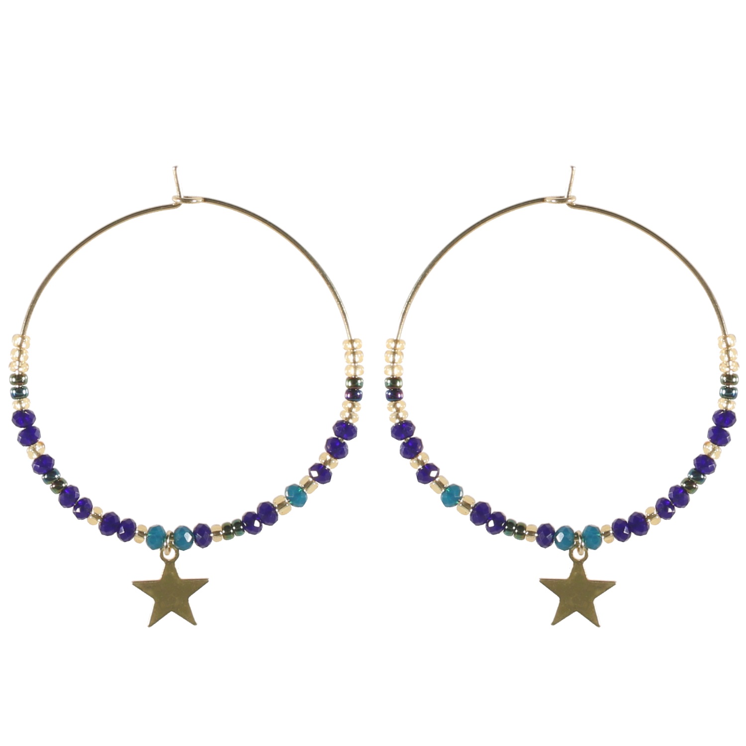 Boucles d'oreilles créoles fantaisie avec étoile en métal doré et perles de couleur.