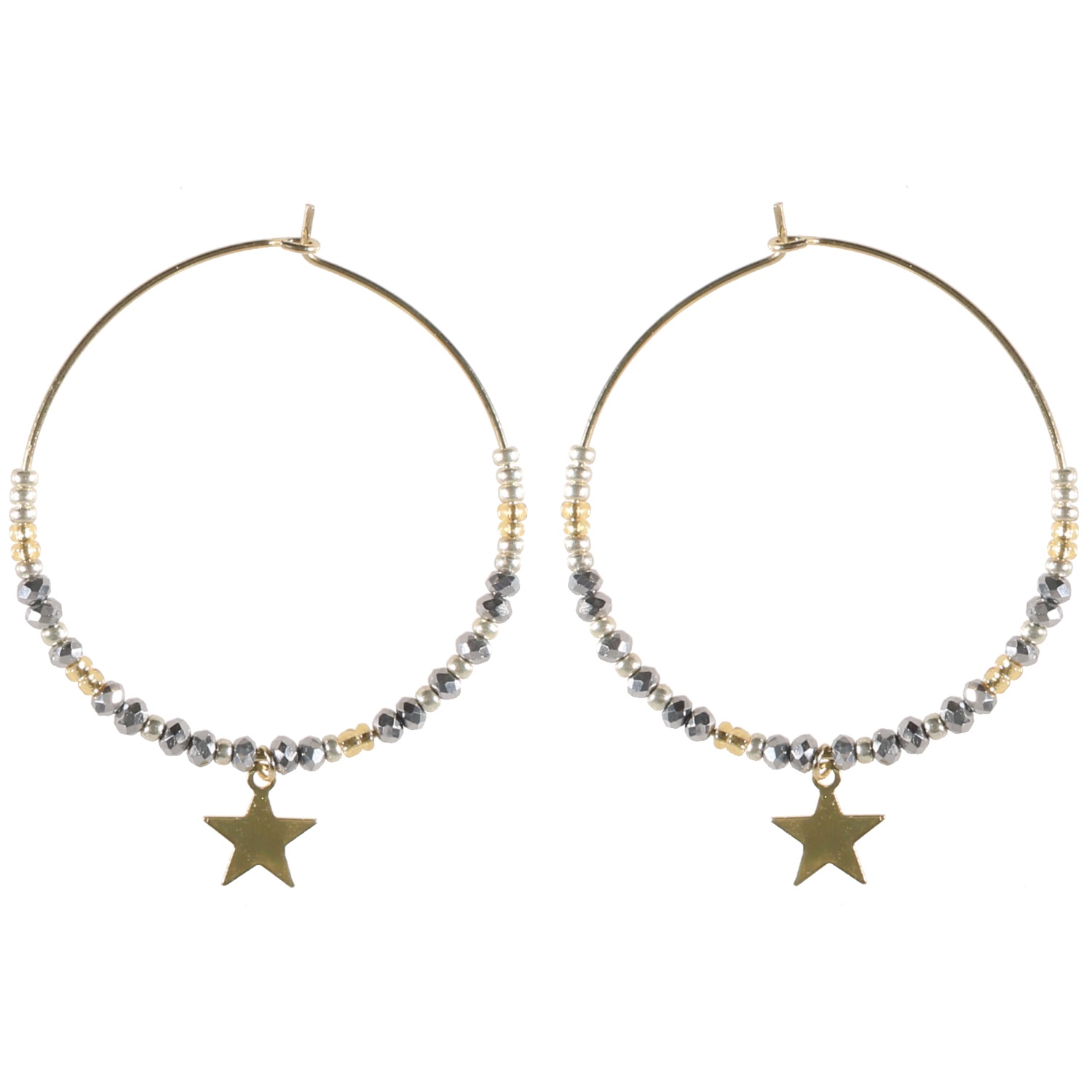 Boucles d'oreilles créoles fantaisie avec étoile en métal doré et perles de couleur.