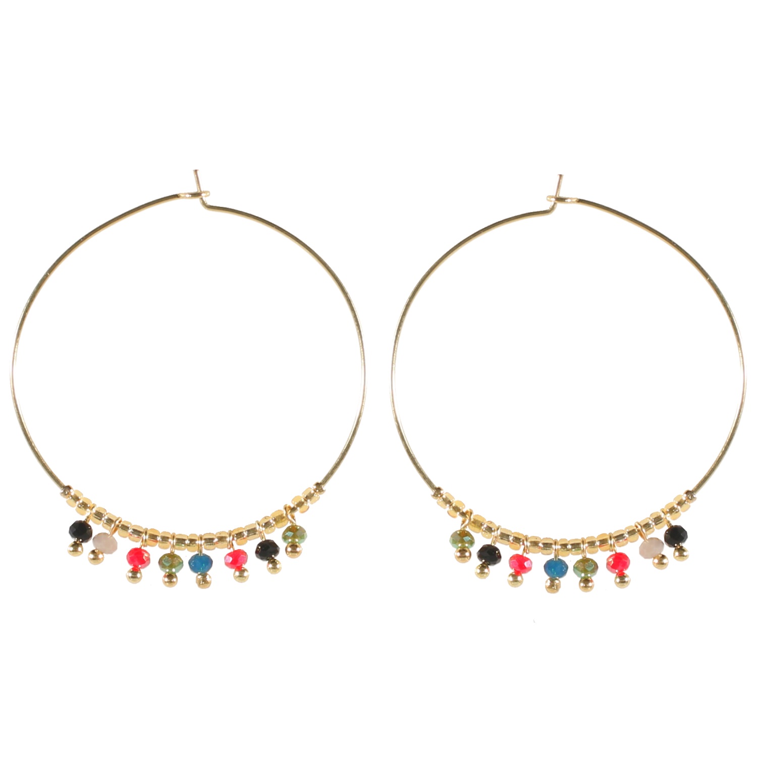Boucles d'oreilles créoles fantaisie en métal doré et perles de couleur.