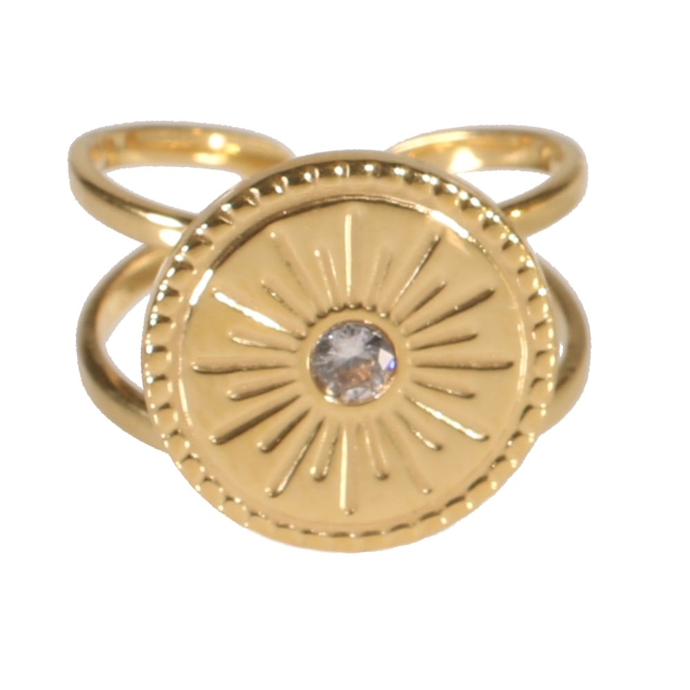 Description Bague en acier doré et un cristal en verre. Taille ajustable. Cliquez sur une matière, un thème, une couleur ou une collection pour voir tous les articles associés.