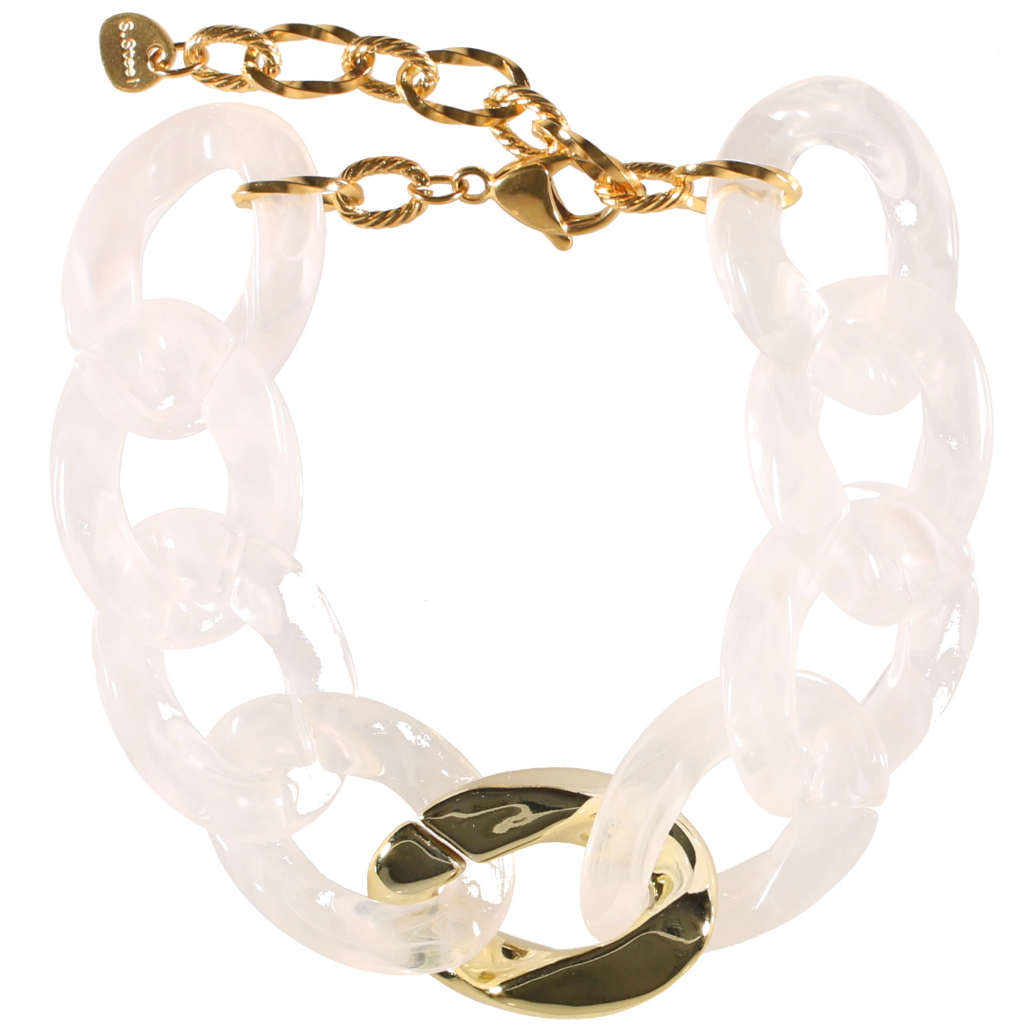 Description Bracelet composé de grosse mailles en plastique de couleur blanche et dorée. Fermoir mousqueton en acier doré avec 4 cm de rallonge. Longueur 18+4 cm [Guide des tailles] Largeur 20 mm Matière(s) Acier , Plastique . L'acier utilisé dans la bijouterie existe sous plusieurs qualités. Nous utilisons principalement la qualité 316L, qualité qui est utilisée en chirurgie. Cet acier est donc inoxydable et reste très résistant. Fermoir Mousqueton Couleur(s) dominante(s) Blanc , Doré Public Adolescent , Adulte . Genre Femme , Fille . Saison Indémodable . Cliquez sur une matière, un thème, une couleur ou une collection pour voir tous les articles associés.