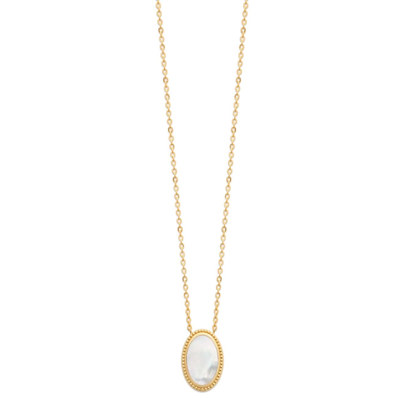 Collier en plaqué or 18 carats et pendentif avec pierre ovale de nacre sertie clos.
