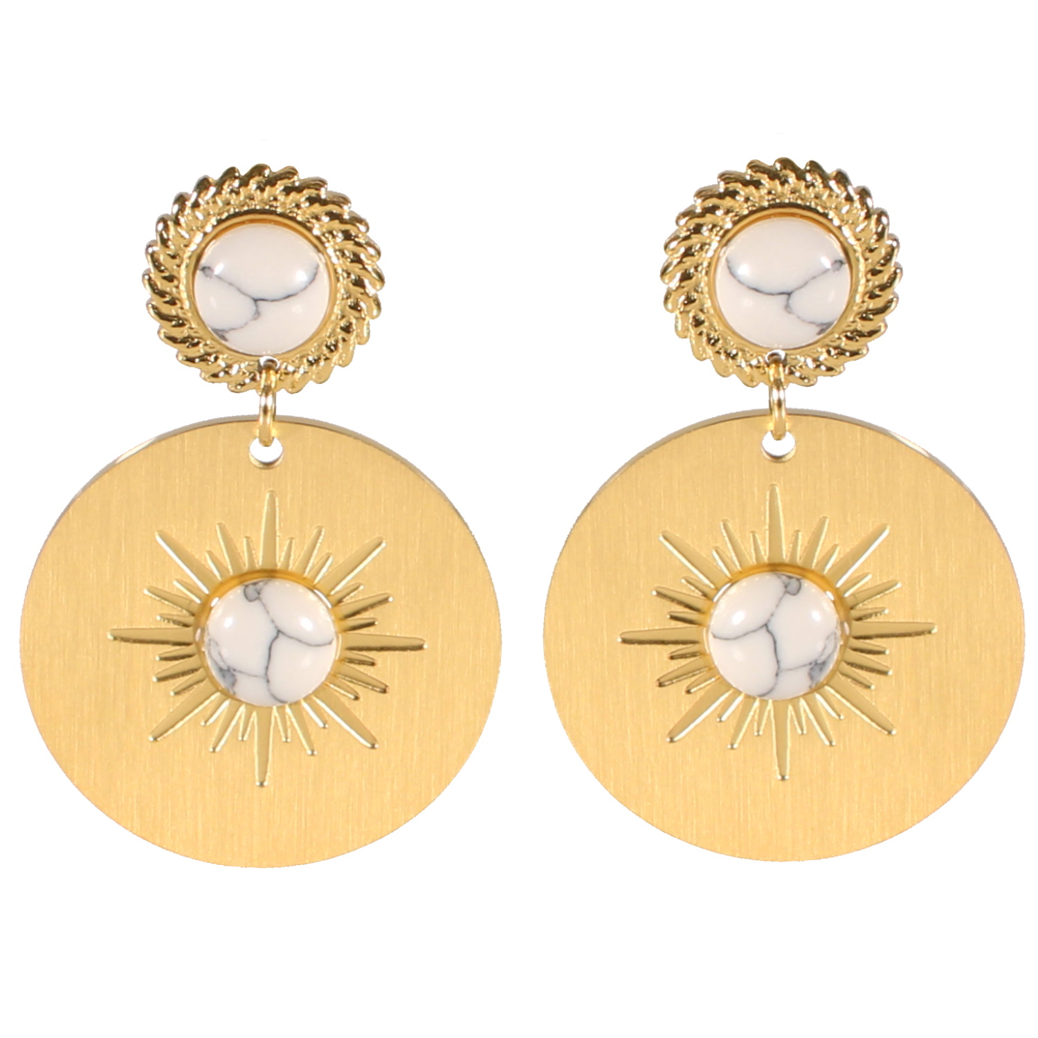 Description Boucles d'oreilles pendantes composées d'une pastille ronde en acier 316L doré surmontée d'une pierre de couleur blanche et d'une pastille ronde avec motif d'étoile en acier 316L doré surmontée d'une pierre de couleur blanche. Largeur 22 mm Hauteur 34 mm Matière(s) Acier , Rocaille . L'acier utilisé dans la bijouterie existe sous plusieurs qualités. Nous utilisons principalement la qualité 316L, qualité qui est utilisée en chirurgie. Cet acier est donc inoxydable et reste très résistant. Fermoir Tiges poussettes Couleur(s) dominante(s) Blanc , Doré Public Adolescent , Adulte . Genre Femme , Fille . Saison Indémodable . Cliquez sur une matière, un thème, une couleur ou une collection pour voir tous les articles associés.