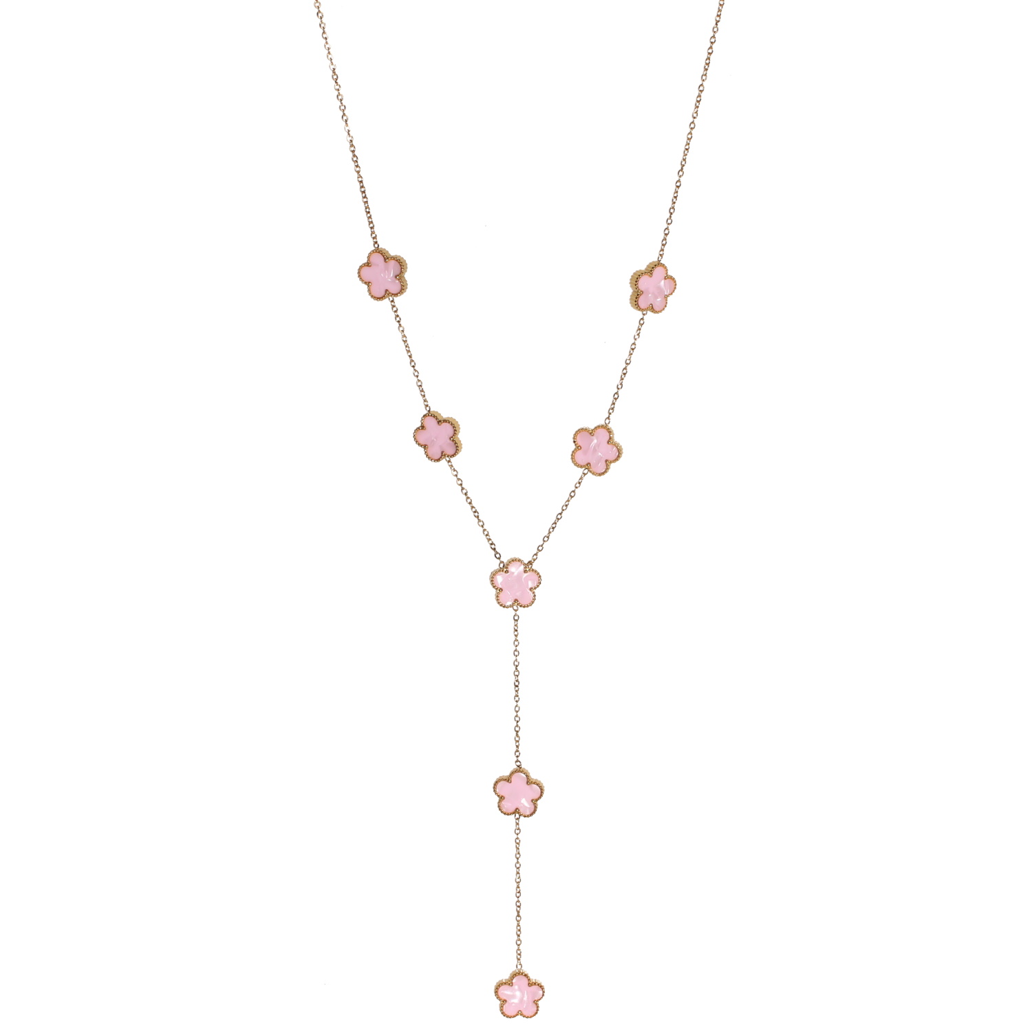 Description Collier sautoir de forme Y en acier doré et fleurs serties d'une pierre rose. Cliquez sur une matière, un thème, une couleur ou une collection pour voir tous les articles associés.