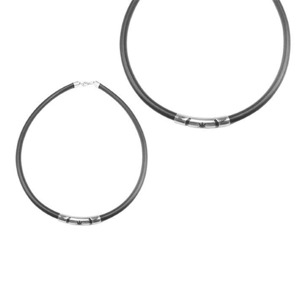 Description Collier fantaisie en caoutchouc noir et métal argenté. Cliquez sur une matière, un thème, une couleur ou une collection pour voir tous les articles associés.