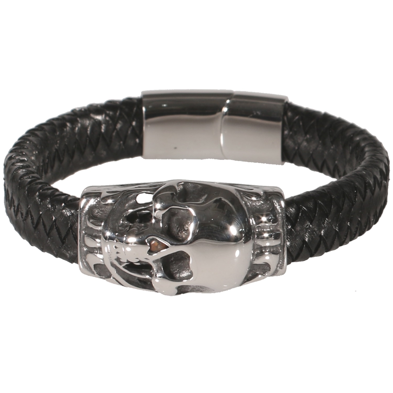 Description Bracelet pour homme en cuir, tête de mort et fermoir en métal argenté. Cliquez sur une matière, un thème, une couleur ou une collection pour voir tous les articles associés.